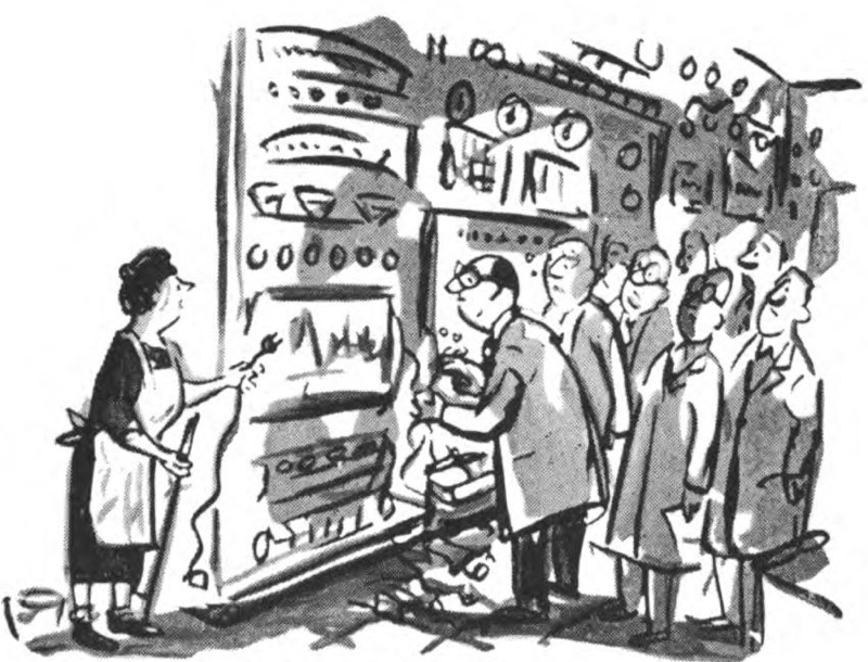 We have talked of the computer’s giant strides in banking. 13Its wide use in stores is not far off. An English computer firm has designed an automatic supermarket that assembles ordered items, prices them, and delivers them to the check stand. At the same time it keeps a running inventory, price record, and profit and loss statement, besides billing the customer with periodic statements. The storekeeper will have only to wash the windows and pay his electric power bill.