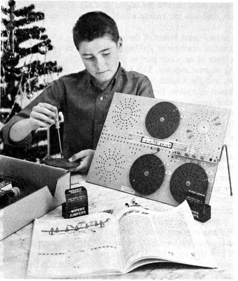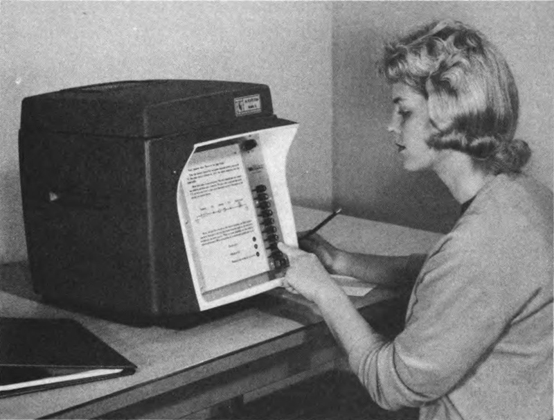 Along with computing machines a whole new technology is growing. Universities and colleges—even high schools—are teaching courses in computers. And the computer itself is getting into the teaching business too. The “teaching machine” is one of the most challenging computer developments to come along so far. These mechanical professors range from simple “programmed” notebooks, such as the Book of Knowledge and Encyclopedia Britannica are experimenting with, to complex computerized systems such as that developed by U.S. Industries, Inc., for the Air Force and others.