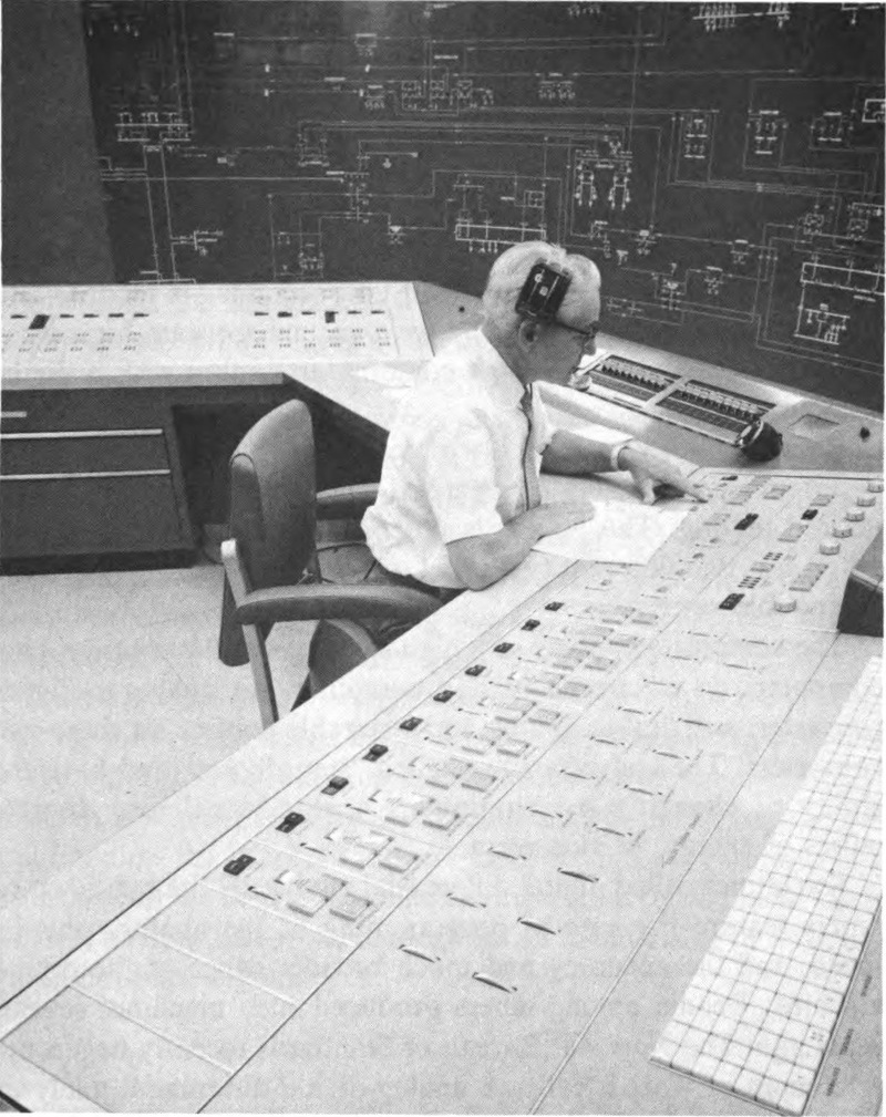 Programmer at console of computer used in electronic processing of bank checking accounts.