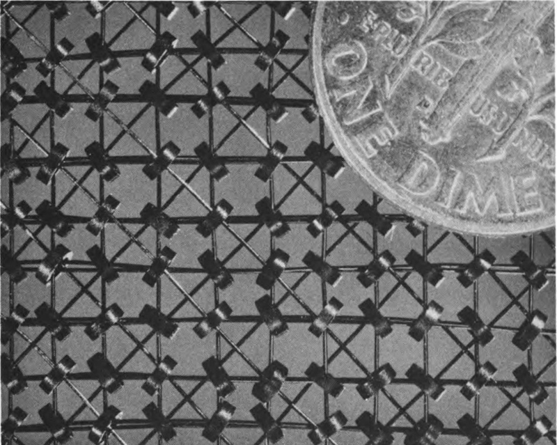 This experimental “memory plane” consists of 135 cryotron devices built up in a 19-layer “sandwich.” Produced automatically, it is an example of continued shrinking of computer elements.