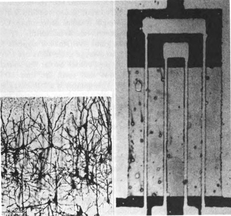 Writing on the head of a pin was a prophetic bit of showmanship, and pinhead-size computers will not necessarily have pinhead mentalities. This progress toward a seemingly hopeless goal takes on an inexorable quality when the writings of von Neumann are compared with the state of the art today. Starting out much faster but much larger than similar elements of the brain, computer components have been made even faster while simultaneously shrinking dramatically toward the dimensions necessary to produce quantitative equivalence. It happens that these goals work out well together, the one helping the other. Circuitry is now at the point where speed is ultimately dependent on that limiter of all physical activity, the speed of light, or of electrons through a conductor. Only by putting elements closer together can speed be increased; thus one quality is not achieved at the sacrifice of the other.