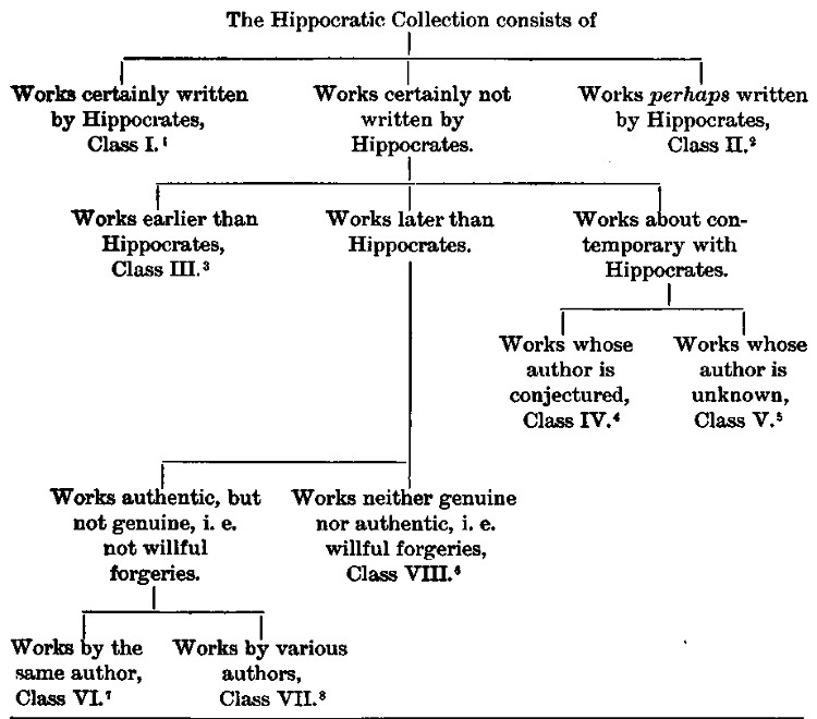 In the next section I intend to give a careful analysis of all the writings which have come down to us from antiquity under the name of Hippocrates, and to state clearly the grounds upon which some are to be received as genuine, and others rejected as supposititious. I shall conclude the present section, although it may appear that I am anticipating some things which had better have come after the succeeding one, with a brief account of our author’s general principles, both as regards the theory and the practice of medicine; and in doing this I mean not to confine myself strictly to the treatises which are acknowledged to be genuine, as they are unfortunately so few in number, that we are often obliged to guess at the tenets of our author from those held by his immediate successors and disciples.