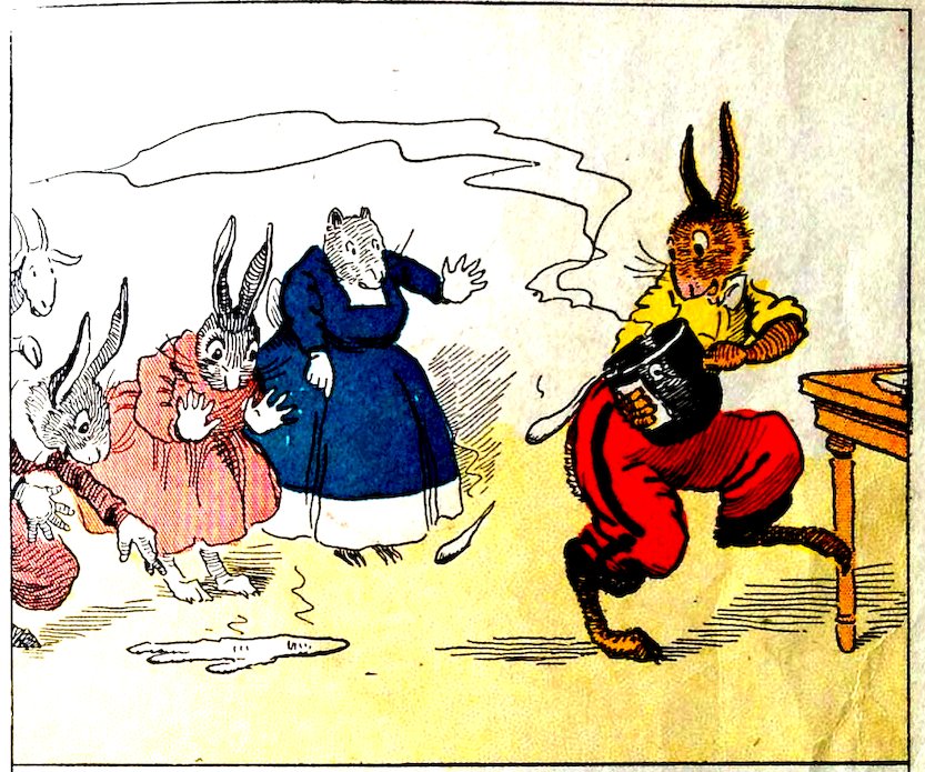 Just as Uncle Wiggily told the goat gentleman that tall silk hats were useful, along came Susie Littletail the rabbit girl. “Oh, boo hoo!” sobbed Susie. “There’s a hole in the pail and all the milk is running out!” Uncle Wiggily took off his nice shiny hat and said: “Never mind, Susie! I’ll save the milk for you!” Uncle Butter gave a loud bleat. “Mr. Longears!” cried the goat, “what are you doing?”