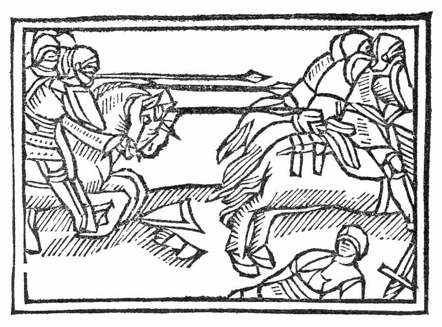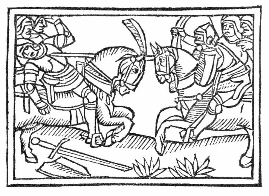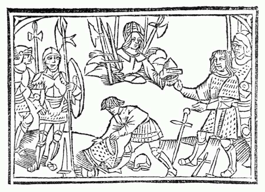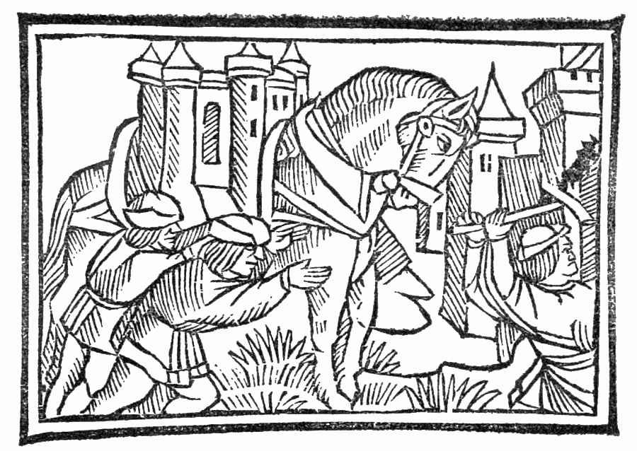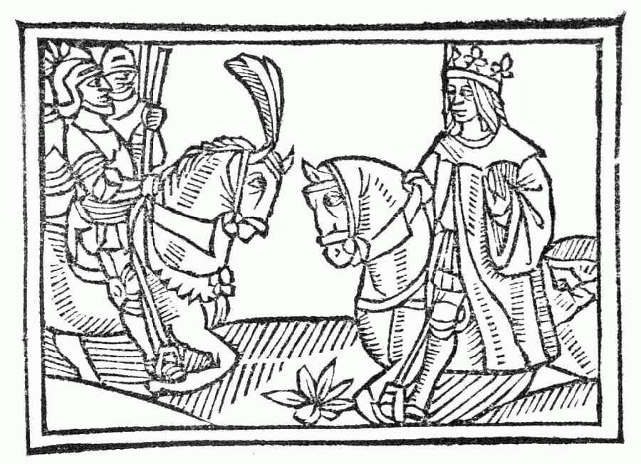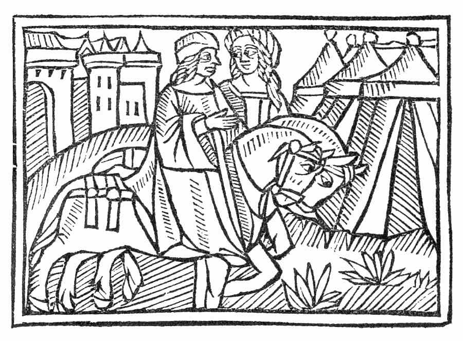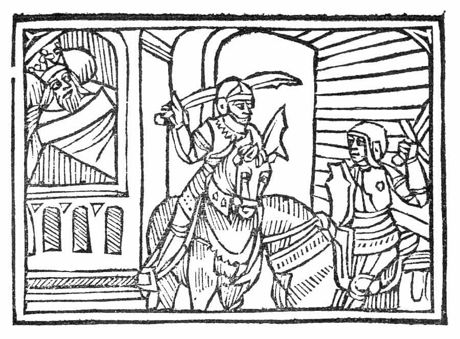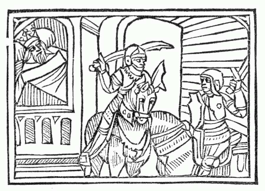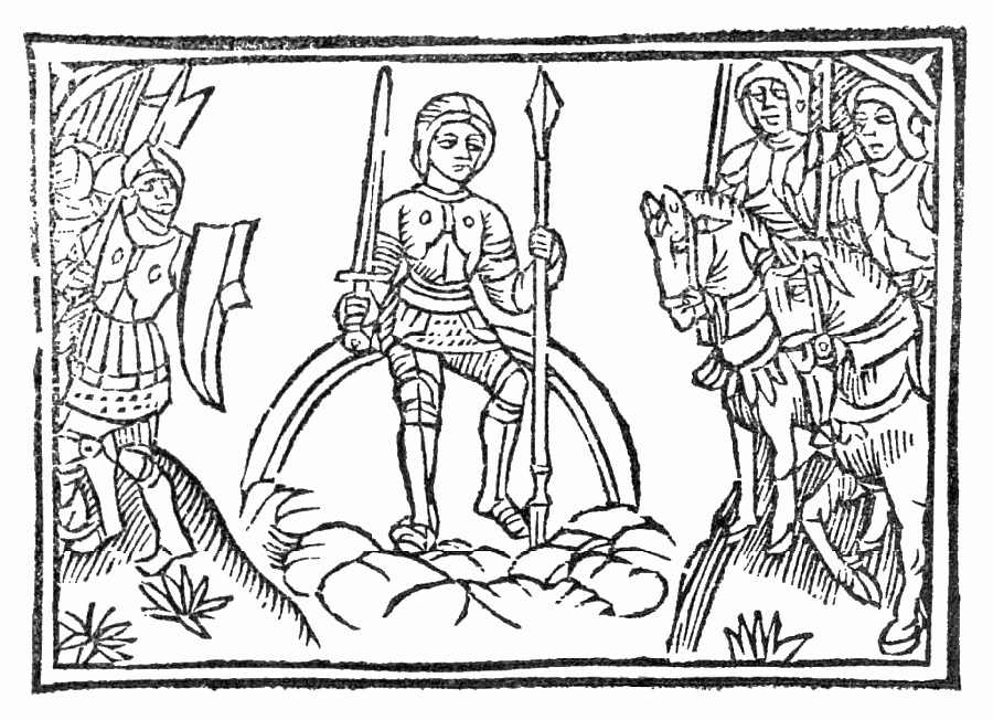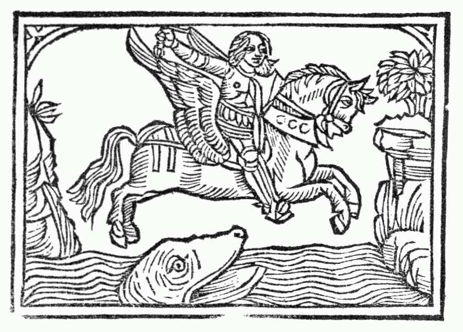 Et pource que c’est chose convenable que au bon chevalier soit deu honneur & reverence en ferons figure selon la maniere des poetes. Perseus fut ung moult vailant chevalier/ & plusieurs royaulmes acquist & de luy fut la grant terre de perse nommee & dirent les poetes que il chevauchoit le cheval qui par l’air vole que ilz nommerent pesagus. Et est a entendre renommee qui par l’air vole & va en tous pays il portoit en sa main ung fauchon ou une faulx qui est dit pour la grant foison de gens qui par luy furent desconfitz en maintes batailles. Il delivra andromeda de la velue. ce fut une pucelle que il delivra de ung monstre de mer qui par la sentence de dieu devorer la devoit/ qui est a entendre que tous chevaliers doivent secourir femmes qui besoing de leur ayde ayront. Si peult estre noté perseus/ & le cheval qui vole bonne renommee que le bon chevalier doibt avoir et acquerir par ses bonnes merites/ & la doibt chevaucher/ c’est que son nom doibt estre porté en toutes terres. Et dit Aristote. Bonne renommee fait l’homme reluisant au monde/ & agreable en la presence des princes.