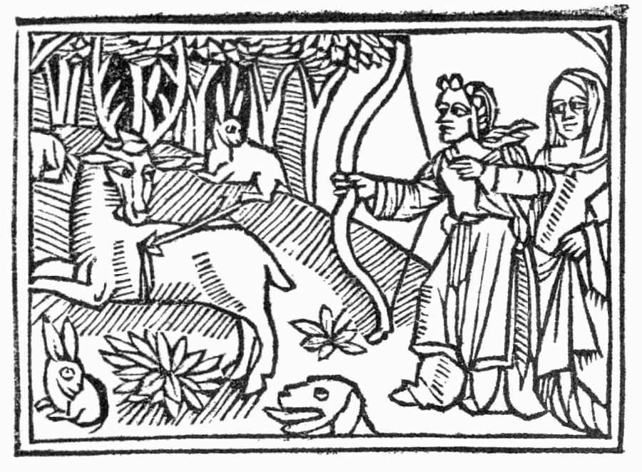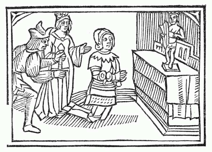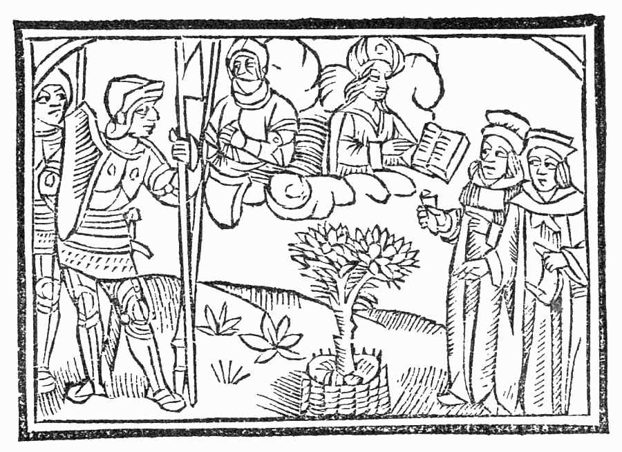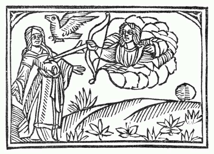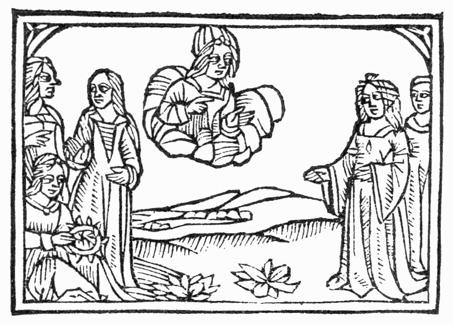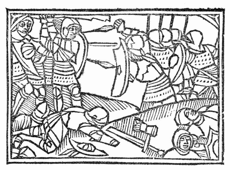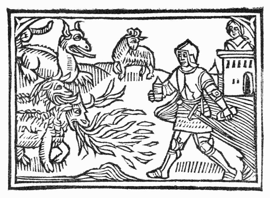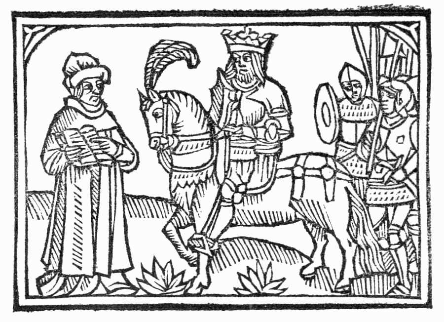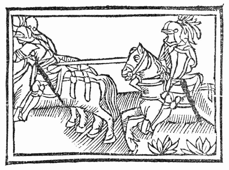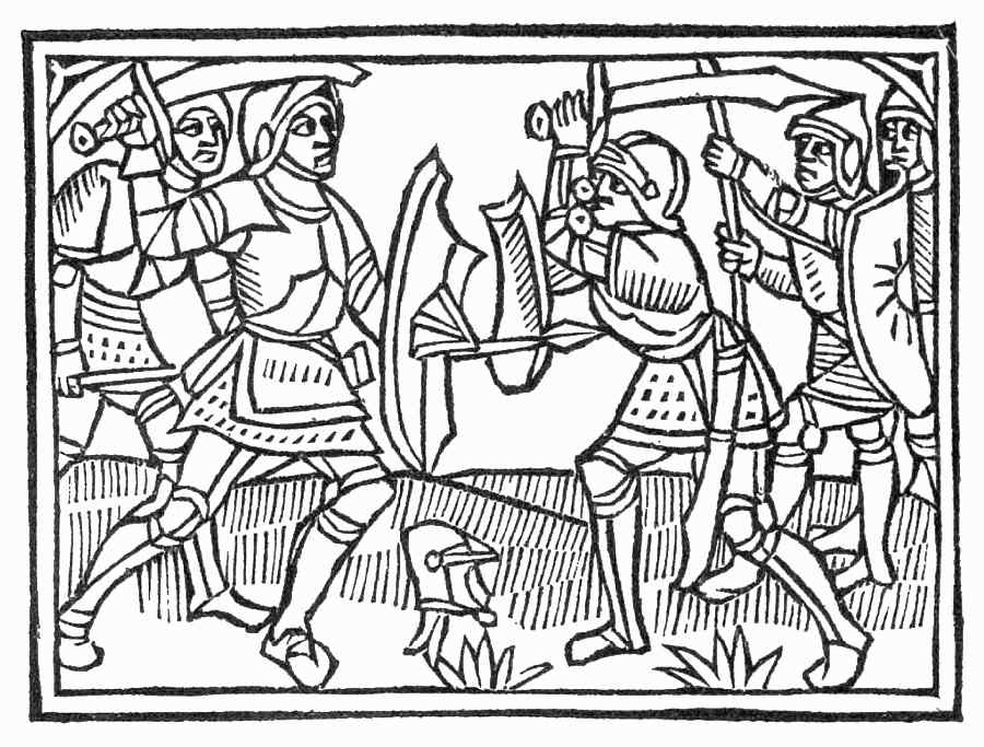 Et pource que c’est chose convenable que au bon chevalier soit deu honneur & reverence en ferons figure selon la maniere des poetes. Perseus fut ung moult vailant chevalier/ & plusieurs royaulmes acquist & de luy fut la grant terre de perse nommee & dirent les poetes que il chevauchoit le cheval qui par l’air vole que ilz nommerent pesagus. Et est a entendre renommee qui par l’air vole & va en tous pays il portoit en sa main ung fauchon ou une faulx qui est dit pour la grant foison de gens qui par luy furent desconfitz en maintes batailles. Il delivra andromeda de la velue. ce fut une pucelle que il delivra de ung monstre de mer qui par la sentence de dieu devorer la devoit/ qui est a entendre que tous chevaliers doivent secourir femmes qui besoing de leur ayde ayront. Si peult estre noté perseus/ & le cheval qui vole bonne renommee que le bon chevalier doibt avoir et acquerir par ses bonnes merites/ & la doibt chevaucher/ c’est que son nom doibt estre porté en toutes terres. Et dit Aristote. Bonne renommee fait l’homme reluisant au monde/ & agreable en la presence des princes.