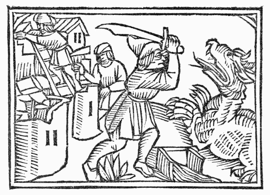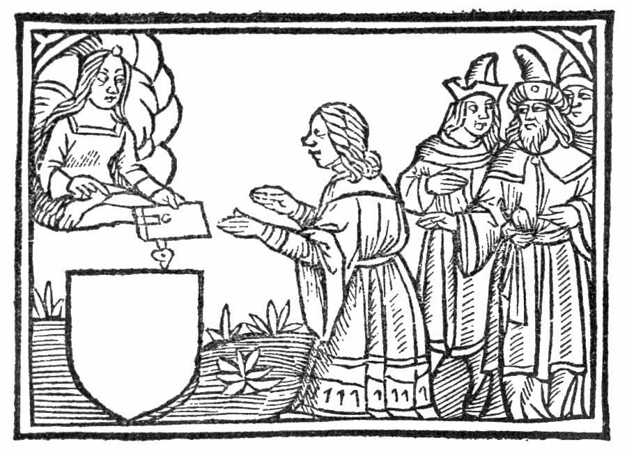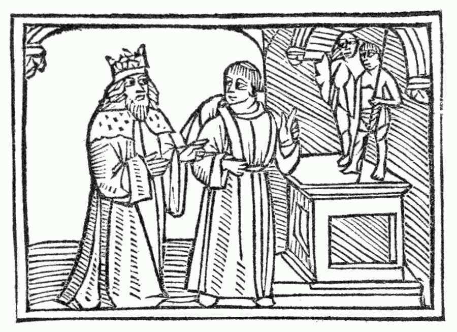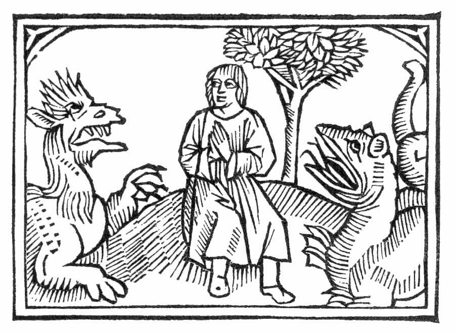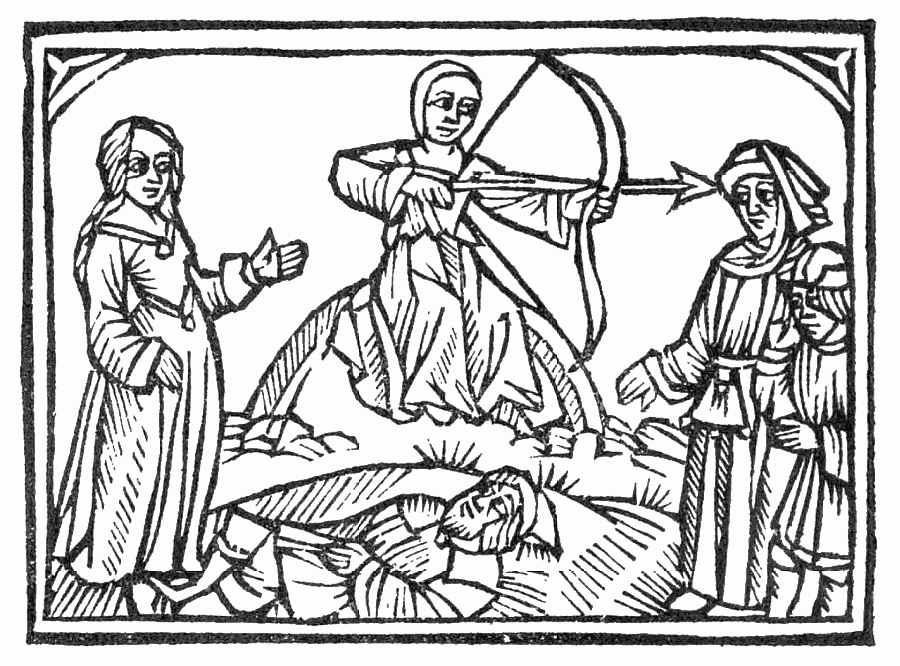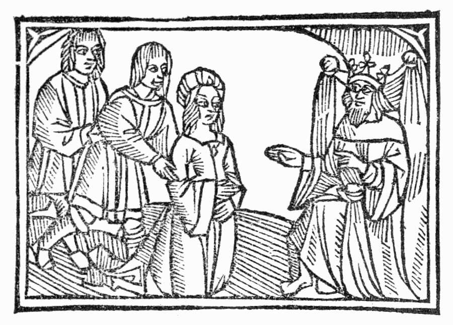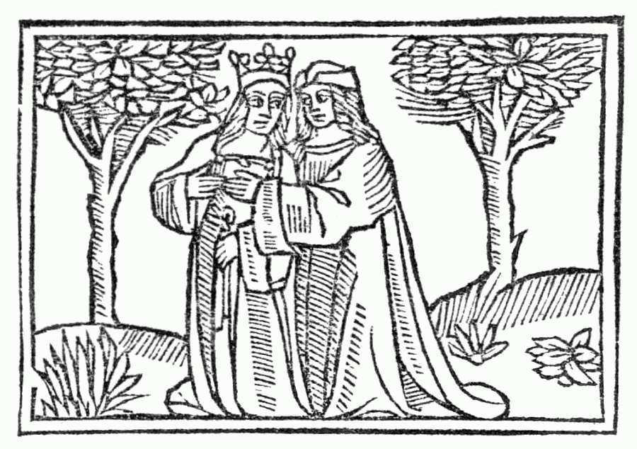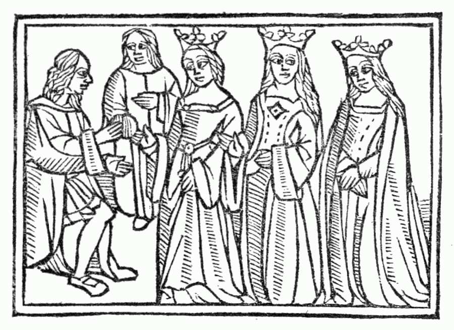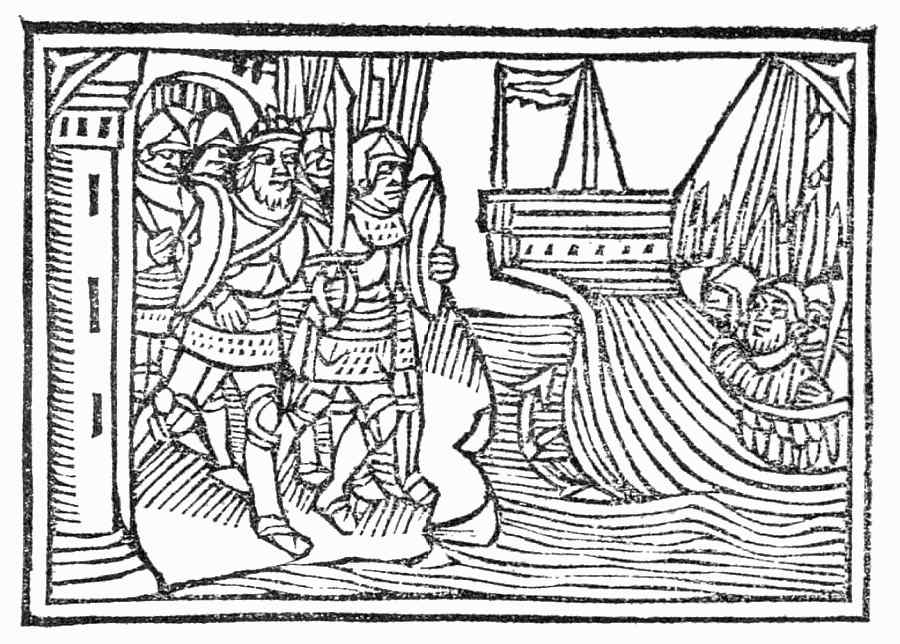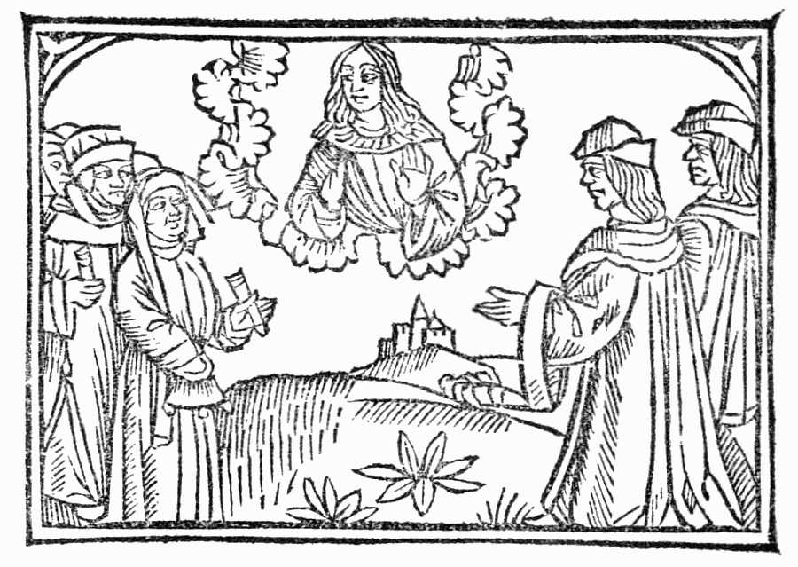 Et pource que c’est chose convenable que au bon chevalier soit deu honneur & reverence en ferons figure selon la maniere des poetes. Perseus fut ung moult vailant chevalier/ & plusieurs royaulmes acquist & de luy fut la grant terre de perse nommee & dirent les poetes que il chevauchoit le cheval qui par l’air vole que ilz nommerent pesagus. Et est a entendre renommee qui par l’air vole & va en tous pays il portoit en sa main ung fauchon ou une faulx qui est dit pour la grant foison de gens qui par luy furent desconfitz en maintes batailles. Il delivra andromeda de la velue. ce fut une pucelle que il delivra de ung monstre de mer qui par la sentence de dieu devorer la devoit/ qui est a entendre que tous chevaliers doivent secourir femmes qui besoing de leur ayde ayront. Si peult estre noté perseus/ & le cheval qui vole bonne renommee que le bon chevalier doibt avoir et acquerir par ses bonnes merites/ & la doibt chevaucher/ c’est que son nom doibt estre porté en toutes terres. Et dit Aristote. Bonne renommee fait l’homme reluisant au monde/ & agreable en la presence des princes.