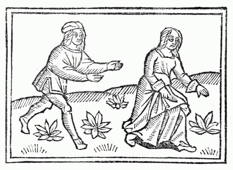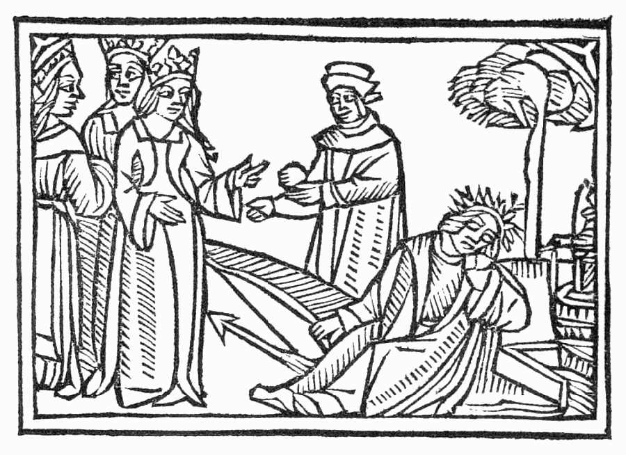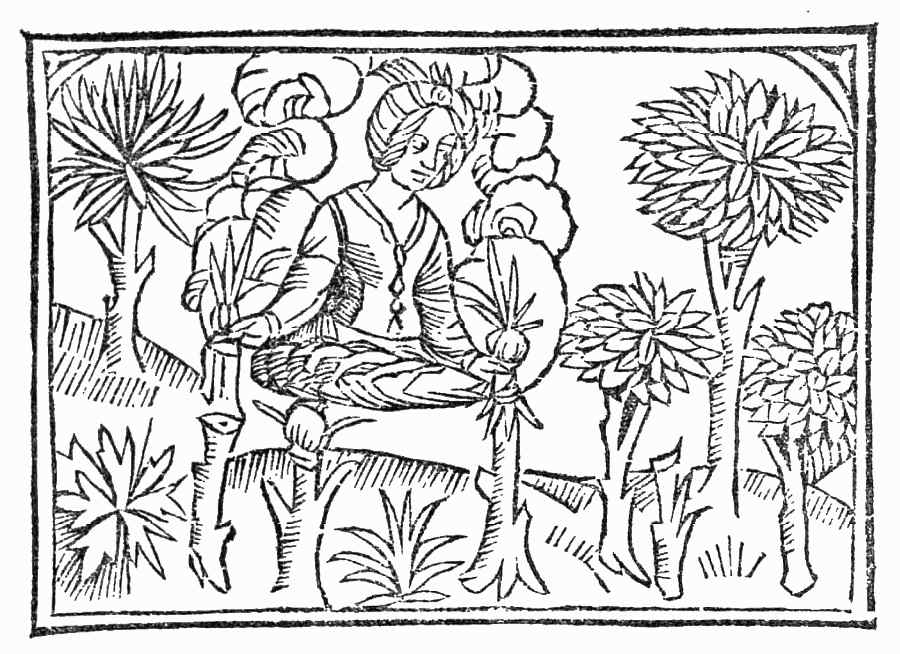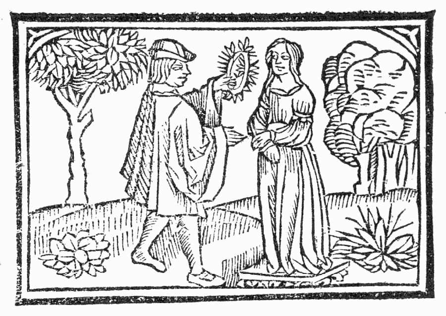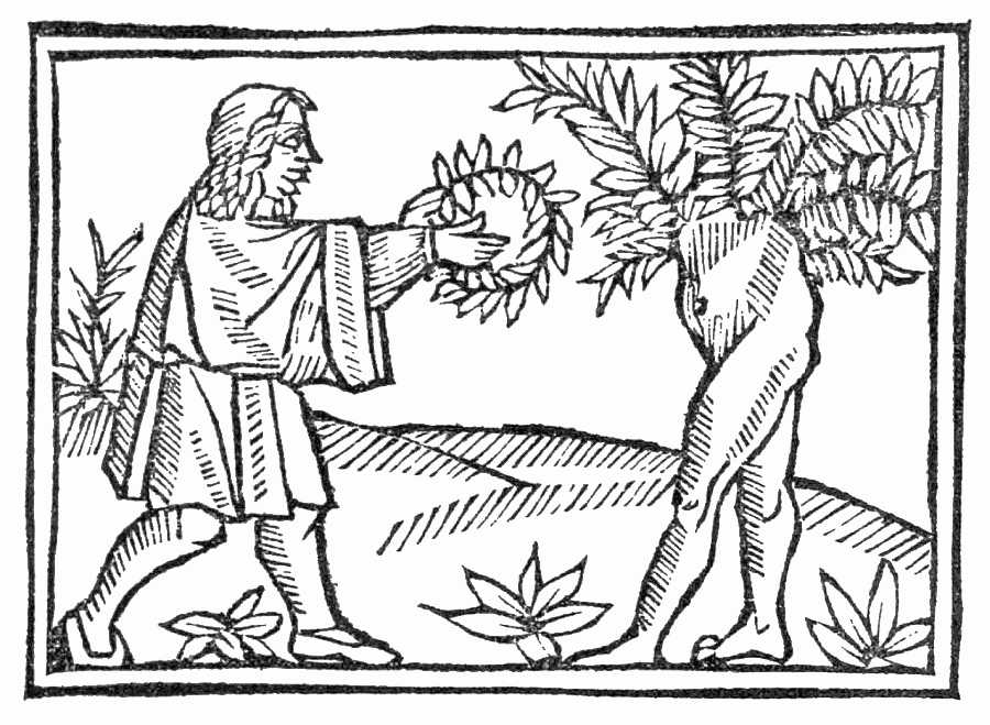 Dit une fable que dampné fut une damoiselle que phebus ayma par amours & moult la poursuyvit mais elle accorder ne s’y vouloit. Advint ung jour que il veit la belle aller par une voye & quant elle le veit venir elle print a fuyr & le dieu apres/ et quant il fut sy pres que elle veit bien que eschapper ne pouoit sa priere fist a dyane la deesse que sa virginité luy voulsist saulver/ & adonc fut le corps de la pucelle mué en ung vert laurier/ & quant phebus fut approché il print des branches de l’arbre & chappeau s’en fist en signe de victoire. Et depuis lors en ça chappeau de laurier signifie victoire/ & mesmes au temps de la grant felicité aux rommains couronnoient de laurier les victorieux.