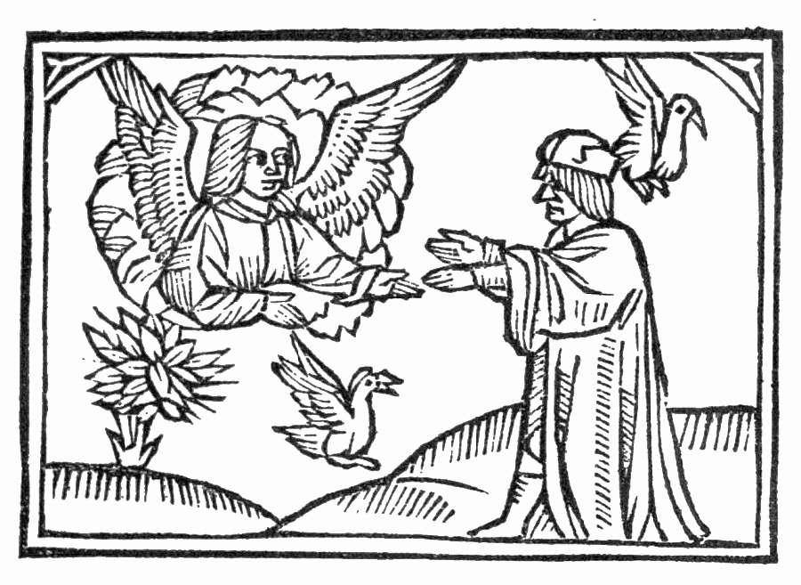 Renommee doibt desirer l’esperit chevalereux entre la noble compaignie des benoictz sainctz de paradis acquise par ses bonnes merites. Le cheval pesagus qui le portera sera son bon ange qui fera bon raport de lui au jour du jugement. Andromeda qui sera delivree/ c’est son ame qu’il delivrera de l’ennemi d’enfer par vaincre peché. Et que on doie oultre ce voler ce est bonne renommee avoir en ce monde affin de dieu non par vaine gloire avoir. Dit saint augustin au livre de correction que deux choses sont necessaires a bien vivre/ c’estassavoir bonne conscience & bonne renommee. Conscience pour soy/ & renommee pour son prochain/ & qui se fie en conscience & despite renommee/ il est cruel. Car c’est signe de noble courage de aymer le bien de renommee. Et a ce propos dit le saige.