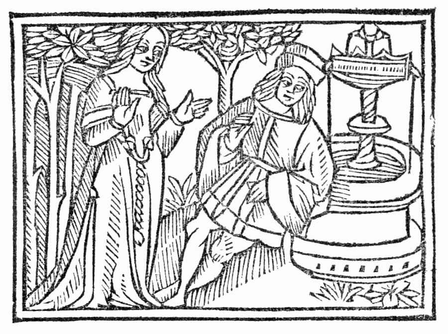 Echo ce dit une fable fut une nimphe/ Et pource que trop grant gengleresse souloit estre & par sa gengle encusa juno qui ung jour guettoit son mari par jalousie/ la deesse s’en couroussa & dist d’ores en avant plus ne parleras premiere si se n’est apres aultruy. Echo fut amoureuse du bel narcisus/ mais pour nulle priere ne pour signe d’amytié que elle luy feist pitié n’en daigna avoir & tant que la belle mourut pour son amour/ mais en mourant pria aux dieux qu’elle peust estre vengee de celuy en qui tant avoit trouvé de cruaulté que encor luy donnassent sentir l’amoureuse pointure parquoy il peust sçavoir la grant douleur que ont les fins amans qui d’amour sont refusez & dont mourir luy convenoit/ atant fina Echo/ mais la voix d’elle remaint qui encor dure/ et la firent les dieux perpetuelle pour memoire de celle adventure & encor respond aux gens en ses valees & sur rivieres apres voix d’aultruy/ mais parler ne peult premiere.
