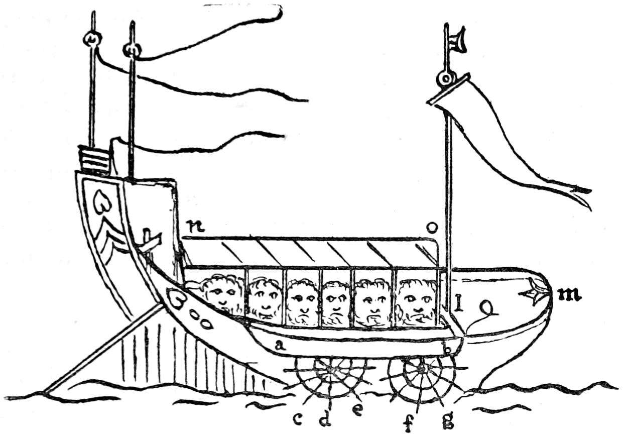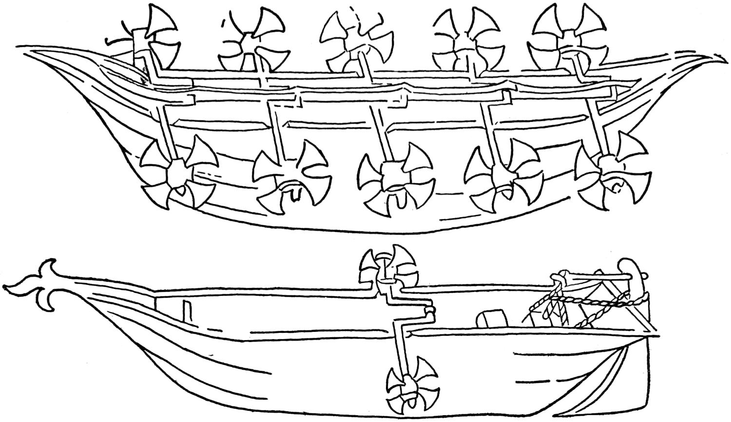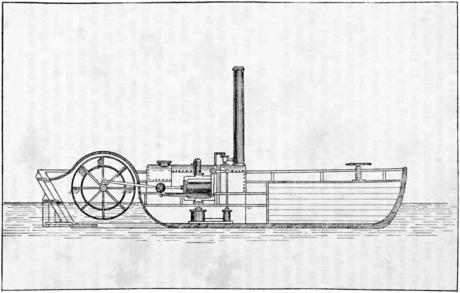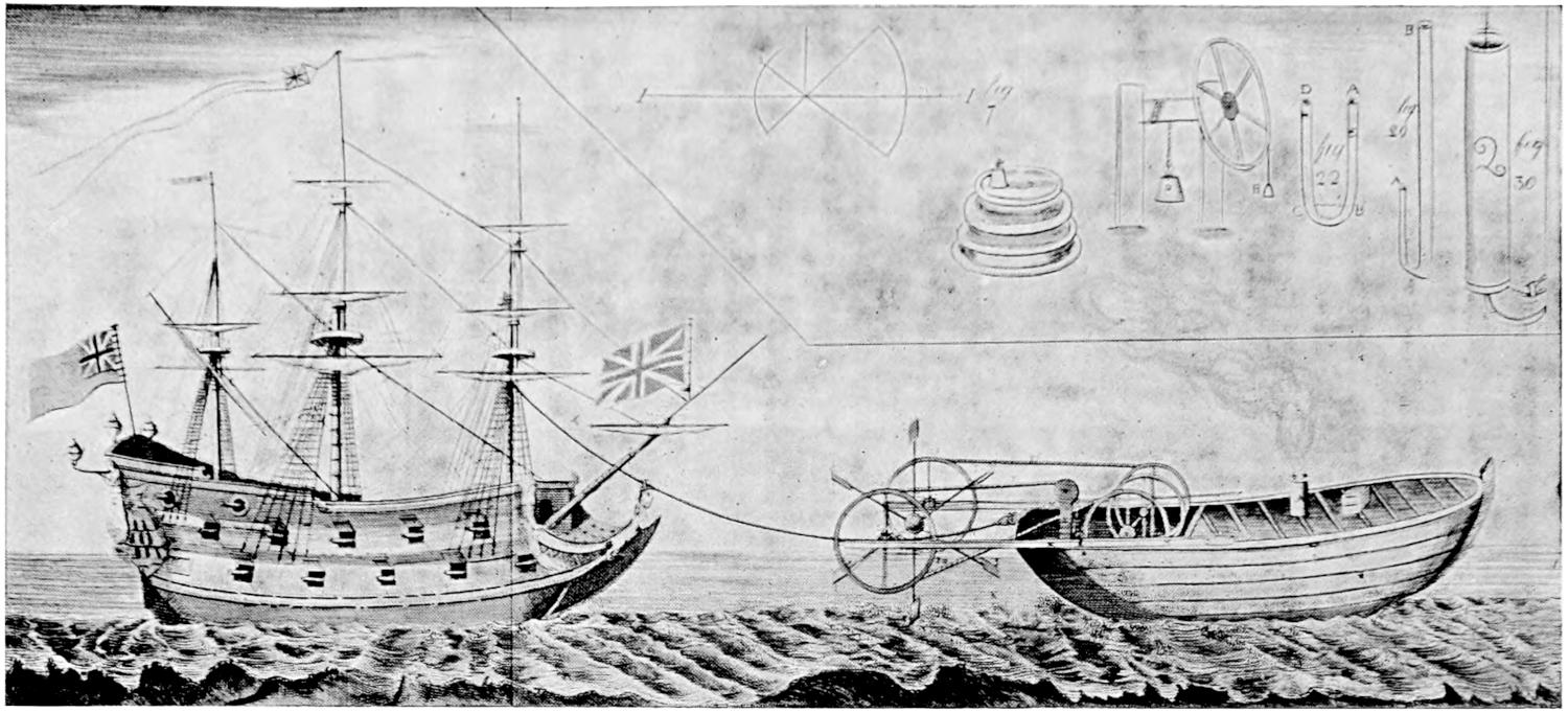 Among eccentricities of design in steamboats may be mentioned cigar ships, vessels shaped like birds, early submarines, double-hulled boats, and numerous other extravagances. One of the earliest submarines was contrived by a Dutchman named Hollar, about 1653, but whether this wonderful vessel ever got beyond the imaginative or paper stage is unknown. There is a picture of it in the British Museum. This singular craft was to be 72 feet in length, 12 feet high, and 8 feet beam, with a wheel in the centre where it “hath its motion.” The description says it was built at Rotterdam. The inventor undertook in one day to destroy 100 ships. “It can go from London to Rotterdam and back in one day, and in six days can go to the[376] East Indies, and can also run as fast as bird can fly.” “No fire, no storm, no bullets can harm her unless it please God.” There is no further trace of her.