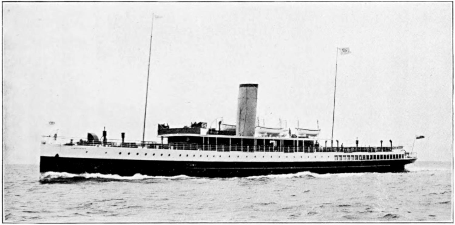 To many shipowning firms I and my publishers are alike indebted for information and the loan of illustrative material; the Peninsular and Oriental Steam Navigation Co., Ltd.; The Cunard Company; the White Star Line; the American Line; the Pacific Steam Navigation Company; the Orient Line; Messrs. Shaw, Savill and Co., Ltd.; Lund’s Blue Anchor Line; the Royal Mail Steam Packet Company; Messrs. Elder, Dempster and Co., Ltd.; the General Steam Navigation Company; the Isle of Man Steam Packet Company, Ltd.; the principal Railway Companies owning steam-ships; the Anchor Line; the Allan Line; Messrs. Brocklebank and Co.; the Bibby Line; Messrs. George Thompson and Son’s Aberdeen Line; the North German Lloyd, and the Hamburg-American Line.
