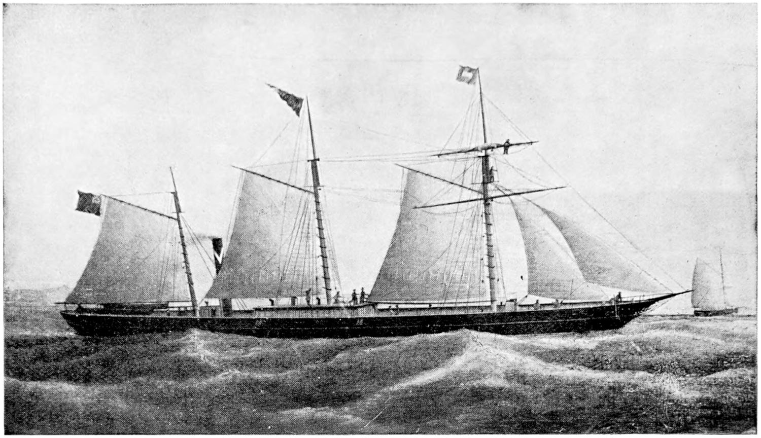 The introduction of steam-propelled vessels was objected to by sailing-yacht owners, but the advantages of auxiliary power in yachts intended for cruising overcame all opposition, and in the course of a few years the number of yachts of all rigs, even cutters, fitted with auxiliary power, steadily increased. Machine-driven yachts are intended as cruisers. A few steam-yachts had paddle-wheels, the latter being specially favoured for all vessels intended for Government or for Royal use, where sea-going qualities were required. One of the most notable of this type was the Victoria and Albert, built to the order of her Majesty the late Queen Victoria, which was, at the time of her launch, one of the finest yachts afloat. Among the earliest of the Royal yachts was the screw steamer Fairy, which was built for the late Queen in 1845 at the Thames Iron Works, Shipbuilding and Engineering Company’s yard at Blackwall, then owned by Messrs. Ditchburn and Mare. This was the first iron vessel owned by the British Government. Her dimensions were: length 144·8 feet, breadth 21 feet 1¹⁄₂ inches, draught 6 feet, displacement 210 tons, horse-power 416, and speed 13·21 knots.