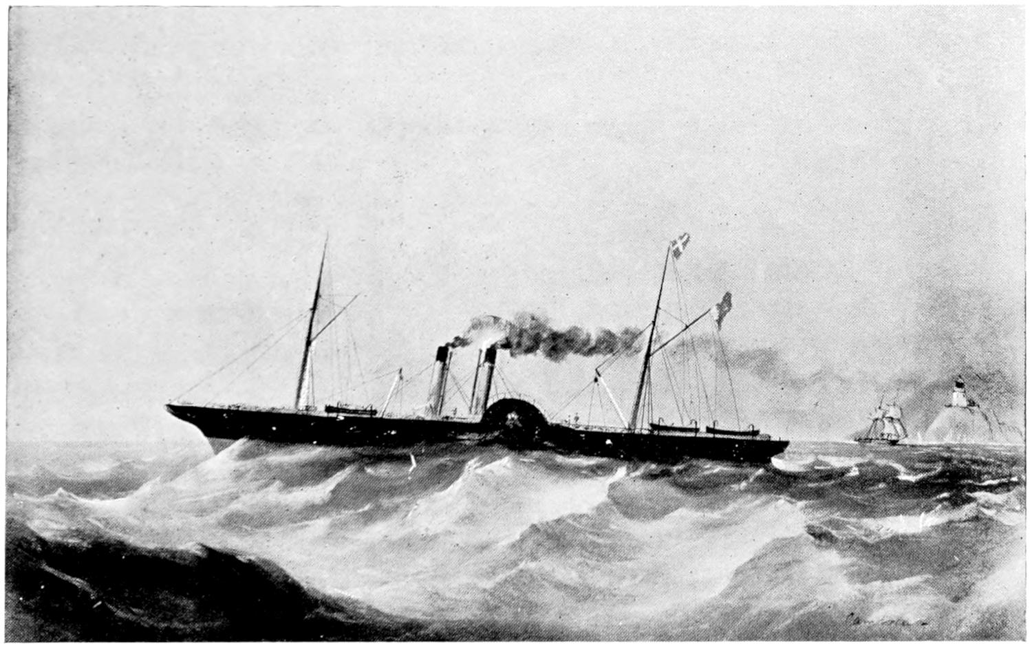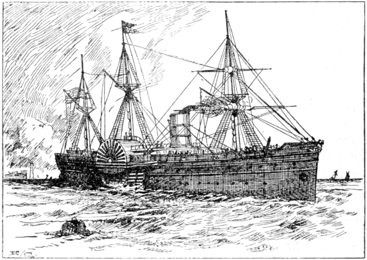 To the category of magnificent failures there should be added the steam-ship Bessemer, launched at Hull in 1874 and designed by and named after Mr. (afterwards Sir) Henry Bessemer. The object her designer had in view was to mitigate the horrors of the cross-Channel passage, and to accomplish this he fitted his boat with a spacious saloon which, by means of a series of pivots and a gyroscope, would remain in a level position without oscillation, no matter how much the vessel might roll or how rough the weather might be. These arrangements worked perfectly in theory, but immediately the Bessemer went to sea for her trials and the test became a practical one, it was discovered that she must be relegated to a conspicuous place among the successes that might have been. Everything about her was on a lavish scale. A peculiarity was that she had four paddle-wheels, two a side, an experiment that has never been successful. Her form also was against her, and in dirty weather she would have been a wet ship, difficult to steer, and almost helpless.