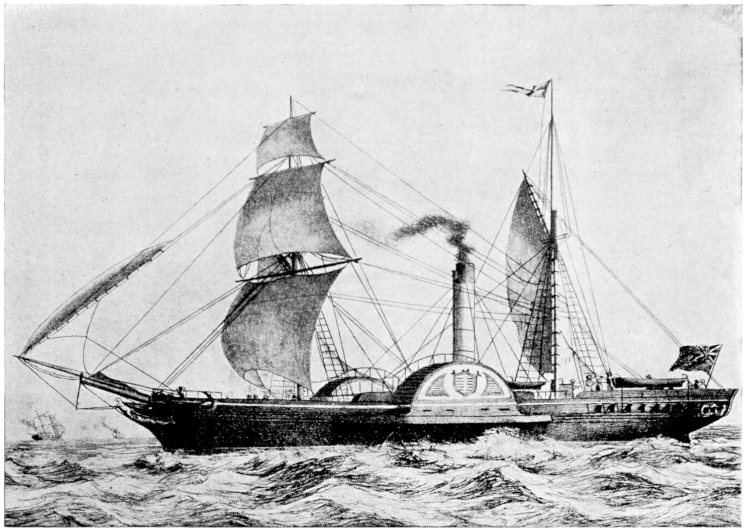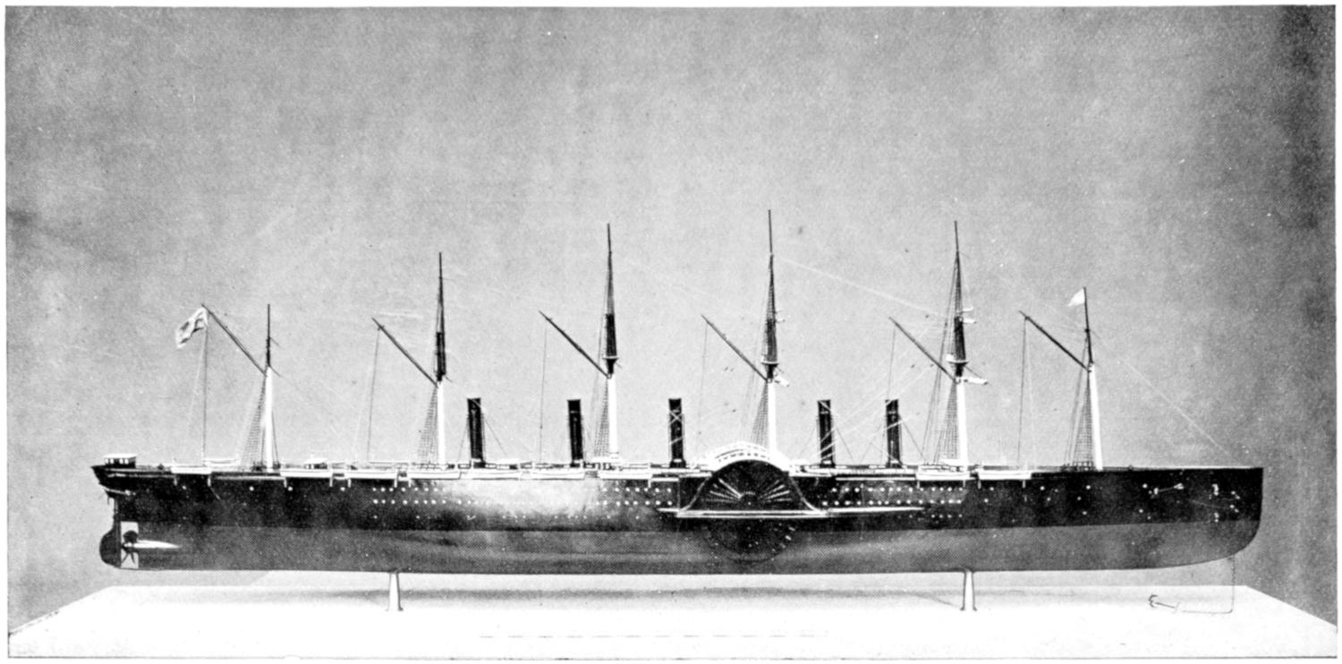 The earliest attempts were made, naturally enough, in the face of great opposition. Every one will remember Stephenson’s famous retort, when it was suggested to him that it would be awkward for his engine if a cow got across the rails, that “it would be very awkward—for the cow”;—and at sea it was the rule for a long while[vii] to regard steam merely as auxiliary to sails, to be used in calms. While ships were still built of wood, and while the early engines consumed a great deal of fuel in proportion to the distance covered, it was impossible to carry enough coal for long voyages, and a large sail-area had still to be provided. Progress was thus retarded until, in 1843, the great engineer Brunel proved by the Great Britain that the day of the wooden ship had passed; and the next ten years were marked by the substitution of iron for wood in shipbuilding.