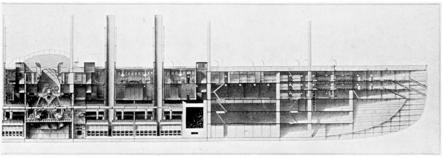 Thenceforward the story of the steam-ship progressed decade by decade. Between 1855 and 1865 paddle-wheels gave place to screw propellers, and the need for engines of a higher speed, which the adoption of the screw brought about, distinguished the following decade as that in which the “compound engine” was evolved. Put shortly, “compounding” means the using of the waste steam from one cylinder to do further work in a second cylinder. The extension of this system to “triple expansion,” whereby the exhaust steam is utilised in a third cylinder, the introduction of twin screws, and the substitution of steel for iron in hull-construction, were the chief innovations between 1875 and 1885. The last fifteen years of the century saw the tonnage of the world’s shipping doubled, and the main features of mechanical progress during that period were another step to “quadruple expansion” and the application of “forced draught,” which gives a greater steam-pressure without a corresponding increase in the size of the boilers. The first decade of the present century has been already devoted to the development of the “turbine” engine.