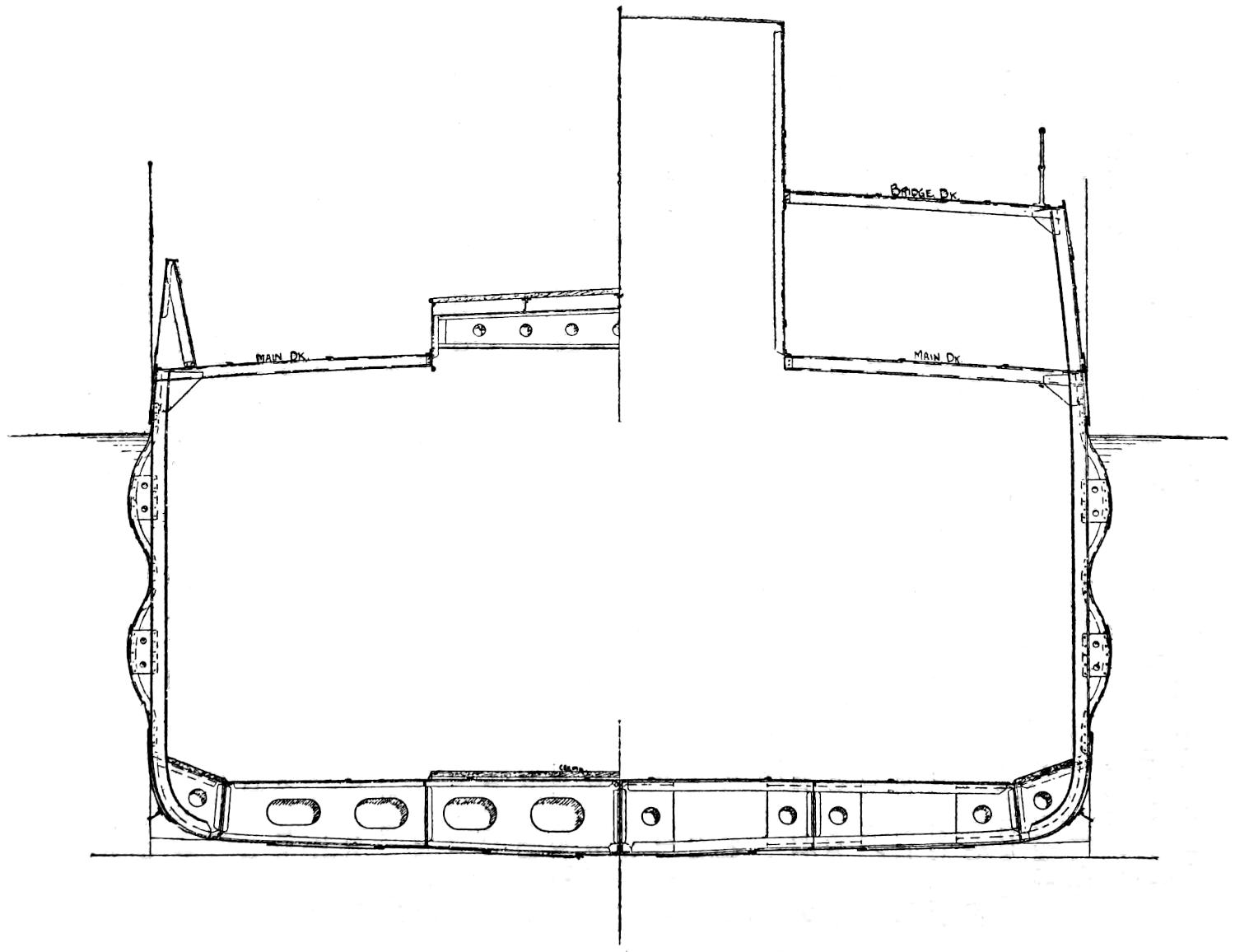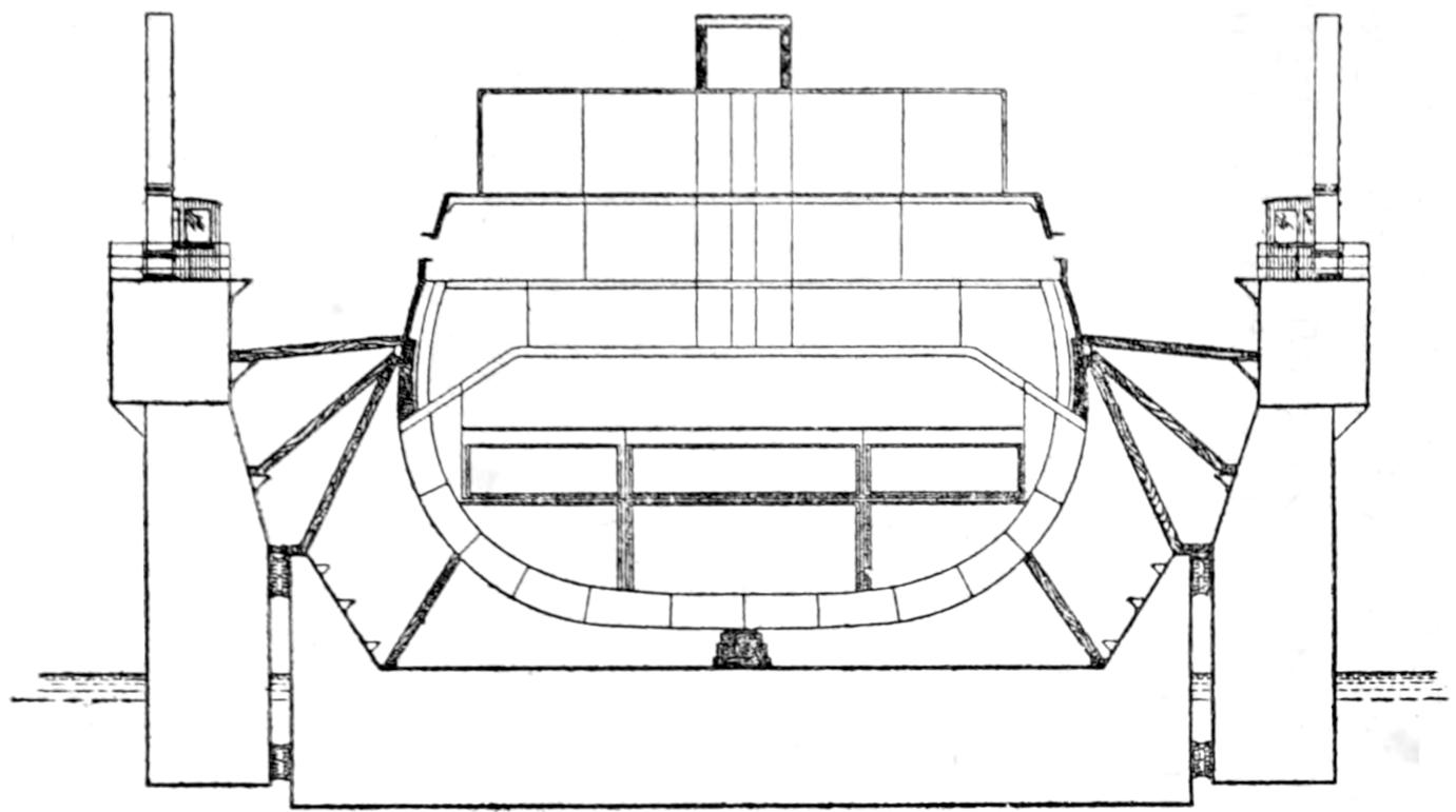 Whether in the sailing days or since, the crossing of the Channel between Dover and Calais has been attended with an amount of misery altogether disproportionate to the shortness of the voyage. It is therefore not surprising that inventors have at one time and another attempted to design vessels which should give the maximum of speed and comfort and the minimum of sea-sickness. The English Channel Steamship Company, Limited, was formed in 1872 to adopt the plan of a steam-ship designed by Captain Dicey, and construct the steam-ship Castalia. His idea was that two large hulls should be used, and placed at such a distance apart that each should act as an outrigger to the other, and the whole structure should remain comparatively steady. The Castalia was built by the Thames Iron Works Company. She was 400 feet long, and each hull had a beam of 20 feet, with a depth of hold of 20 feet. The distance between the two hulls was 35 feet, and they were united by strong girders. The hulls were[378] very sharp at the ends, and flat in the floors, and the draught of water was only 6 feet. The inner sides of the hulls had a freeboard of 14 feet, and the uniting girders were slightly arched, but a difference in the methods of fixing them to the hull was made, compared with previous experience with double-hulled vessels. In former attempts to solve the problem of the navigation of twin steamers, the connecting beams had usually been placed in such a way that their ends extended under the decks of the hulls. This in the case of wood was manifestly a plan which did not permit of a very large vessel or of a certain limit of strength being exceeded. Captain Dicey’s scheme in adopting the arched form of girder was to utilise to the utmost the strength of the iron, and bind with the utmost rigidity the whole structure together. Where the girders entered the hulls the upper part was just under the deck; the girders were carried right across to the outer sides of each hull, additional strength being provided by bolting every girder to a bulkhead. The space between the hulls was decked over, and allowed ample accommodation for passengers. Each hull carried a powerful engine for driving a large paddle-wheel, the wheels being placed with a space between them amidships between the two vessels. The vessel could be steered at either end, thus obviating the necessity of turning, and a navigating bridge extended across the tops of the two paddle-boxes. It was even claimed that the ship would be large enough to carry railway trains across the Channel, but this does not seem to have been tried. As she drew only a trifle over 6 feet of water she could enter the harbours on either side of the Channel at any state of the tide, and though she was steady enough as a sea boat she was too slow, and was withdrawn from service.