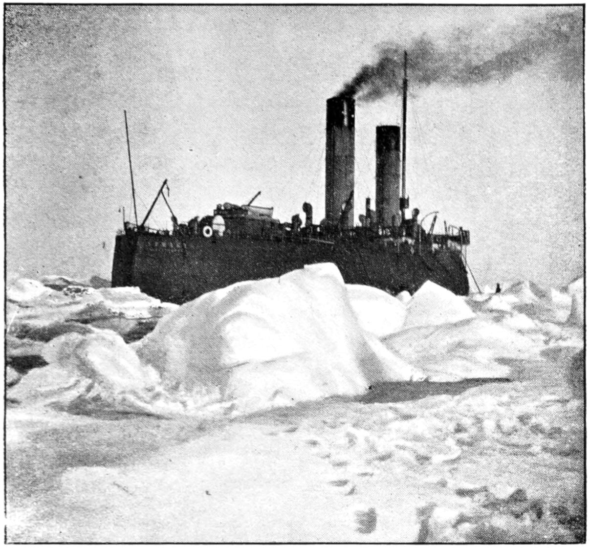 She finds no insuperable difficulty in smashing her way through ice 12 or 13 feet in thickness. The first piece of ice she ever attacked was drift ice about five feet thick, through which she went easily with her engines giving her little more than half-speed. The most serious test was against ice estimated at 25 feet thick, consisting[369] of 5 feet of field ice, 9 feet of pack ice above it, and ice 11 feet thick, and perhaps more, below the field ice. Thick snow on top of thick field ice forms the most serious obstacle, the snow forming an immense cushion or ridge which becomes worse the more an effort is made to get through it. On another occasion she made her way by ramming through ice 34 feet in thickness. Another experience was to rescue eight of nine steamers which were nipped in the ice; the ninth was so badly squeezed by the ice that she sank before the Ermack could force her way to her.