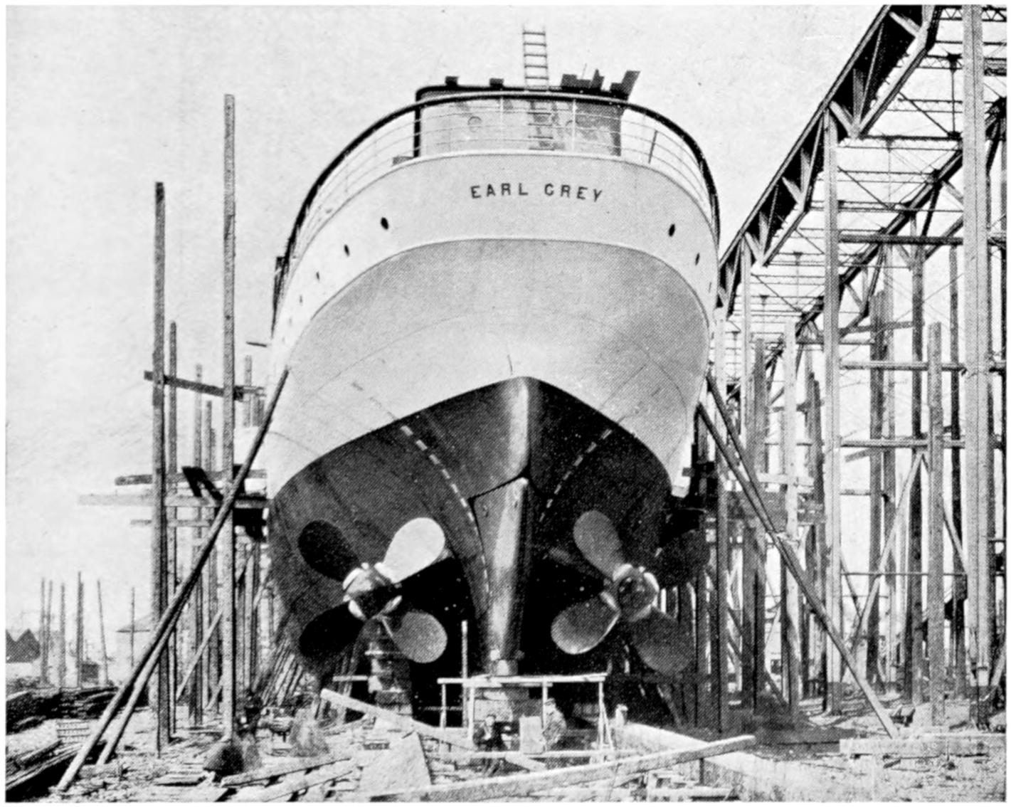 About four years ago the ice-breaking and surveying steamer Lady Grey was launched by Messrs. Vickers, Sons, and Maxim at Barrow-in-Furness for the Canadian Government, and performed some exceedingly effective work, particularly in the St. Lawrence River or in duties associated with the Marine and Fisheries Board. A larger and faster vessel being required, the builders were asked[370] to provide a steamer which, while preserving all the qualities of an ice-breaker, should yet be able to attain a speed of seventeen knots, and be capable of use for a variety of purposes. The Earl Grey was launched in June 1909, and besides fulfilling these requirements has been engaged in the passenger traffic across the Northumberland Straits. She has been fitted with special quarters, enabling her to be employed as an official yacht by the Governor-General. Provided with a cut-water or schooner stem with a short bowsprit, an elliptical stern, and two steel pole schooner-rigged masts, which rake considerably, and having been designed with a graceful sheer, she has more of the appearance of a large yacht than an ice-breaker intended to be able to make her passages in all sorts of weather and under widely varying conditions. The hull is built with extraordinary strength; the frames are very closely spaced in order to take up the thrust of the pack ice which in winter may sometimes be piled round the vessel; the shell plating is of unusual thickness, and the outer skin is double right fore and aft along the water-line and to the bottom of the keel in the fore body, where the friction of the ice tends in the case of ice-breaking steamers to wear away the material. The ordinary practice of this and all other ice-breakers, in whatever part of the world, is to utilise their weight to break the ice by rising upon it and crushing it. In order to possess as great a weight as possible, large tanks are built into the fore part of the Earl Grey which can be filled or emptied at a rate of 250 tons an hour. The vessel is also equipped for breaking ice when going astern, the counter having been suitably strengthened to resist the shocks; while to secure the rudder from injury it has been built into the form of the ship so that her movements are not impeded by the ice-floes. The Earl Grey is 250 feet in length, 47 feet 6 inches beam, 17 feet 7 inches depth, and 3400 tons displacement. She has accommodation for fifty first-class[371] passengers and twenty in the second class, and under these circumstances winter ice-breaking excursions may yet become the vogue among those in search of a new sensation.