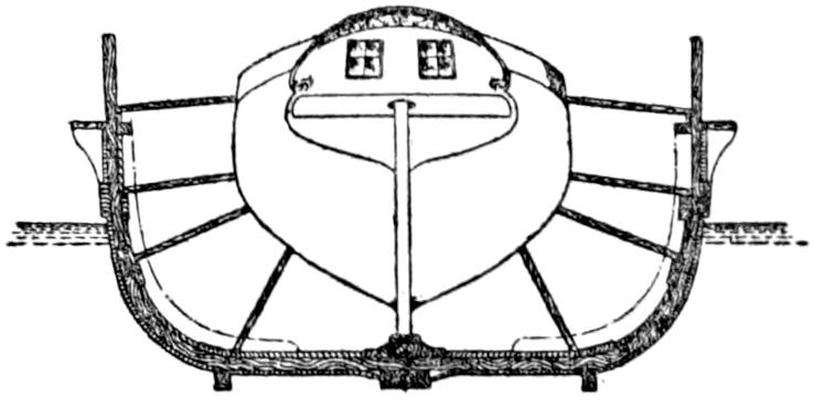 Messrs. Winans’ first cigar ship, though not fulfilling all the hopes formed of her, was, on the whole, sufficiently successful to encourage the continuance of the experiments, for in the two following years she was severely tested both for speed and seaworthiness in all sorts of weather. Another vessel was built at St. Petersburg in 1861 with a submerged screw propeller at the stern, which gave so much more satisfactory results than the revolving belt apparatus that Messrs. Winans were encouraged to order a third spindle ship. This was built by Mr. John Hepworth of the Isle of Dogs, and was named after her inventor, Mr. Ross Winans. This boat was 256 feet in length with a diameter and depth of 16 feet, and was circular in form throughout. The top of the vessel was strengthened for 130 feet amidships by four longitudinal ribs of steel which supported the deck, and also rendered the top as strong to resist tension and other strains as the bottom. Internally there were iron ribs running round the vessel 4 inches deep and 3 feet apart in the engine and boiler room, and 7 inches deep and spaced 6 feet elsewhere. The bottom and side plates were of iron, were thicker amidships than at the end, while the bottom was further strengthened and protected outside the skin plates by a plate of iron 1 inch thick and 33 inches across at its widest and diminishing to a point at the ends. The skin plates of the top were of toughened steel ³⁄₈ inch thick amidships. The two screw propellers, one at either end, were 22 feet in diameter and were only half immersed in the[383] water, though it is difficult to imagine what advantages were supposed to be gained by incomplete immersion, seeing that the exposed part represented so much dead weight to be carried, to say nothing of the other drawbacks. A space 48 feet 6 inches long amidships was devoted to the engines and boilers. Each of the four boilers had a fire-box, and was surmounted by two vertical cylinders containing vertical tubes; while the centre portions of the boilers were tubeless to allow of more ready cleaning and a better circulation. A fan increased the draught and also the ventilation of the ship. The engines were surface-condensing. The problem of allowing the longest possible stroke was ingeniously solved. Above each of the three jacketed steam cylinders was a shaft, carrying two cranks and working by the sides of the cylinder, the piston-rods passing the shaft and connecting with a cross-head above, which was connected with the cranks by two rods. The three engines were joined by a system of return cranks and a peculiar coupling, which prevented cross-strains from the transmission of power from engine to engine, and from the shafts of the different engines getting out of line. The ship could carry coal for twelve days at normal consumption. On deck it carried two masts and two funnels, all having a considerable rake aft.
