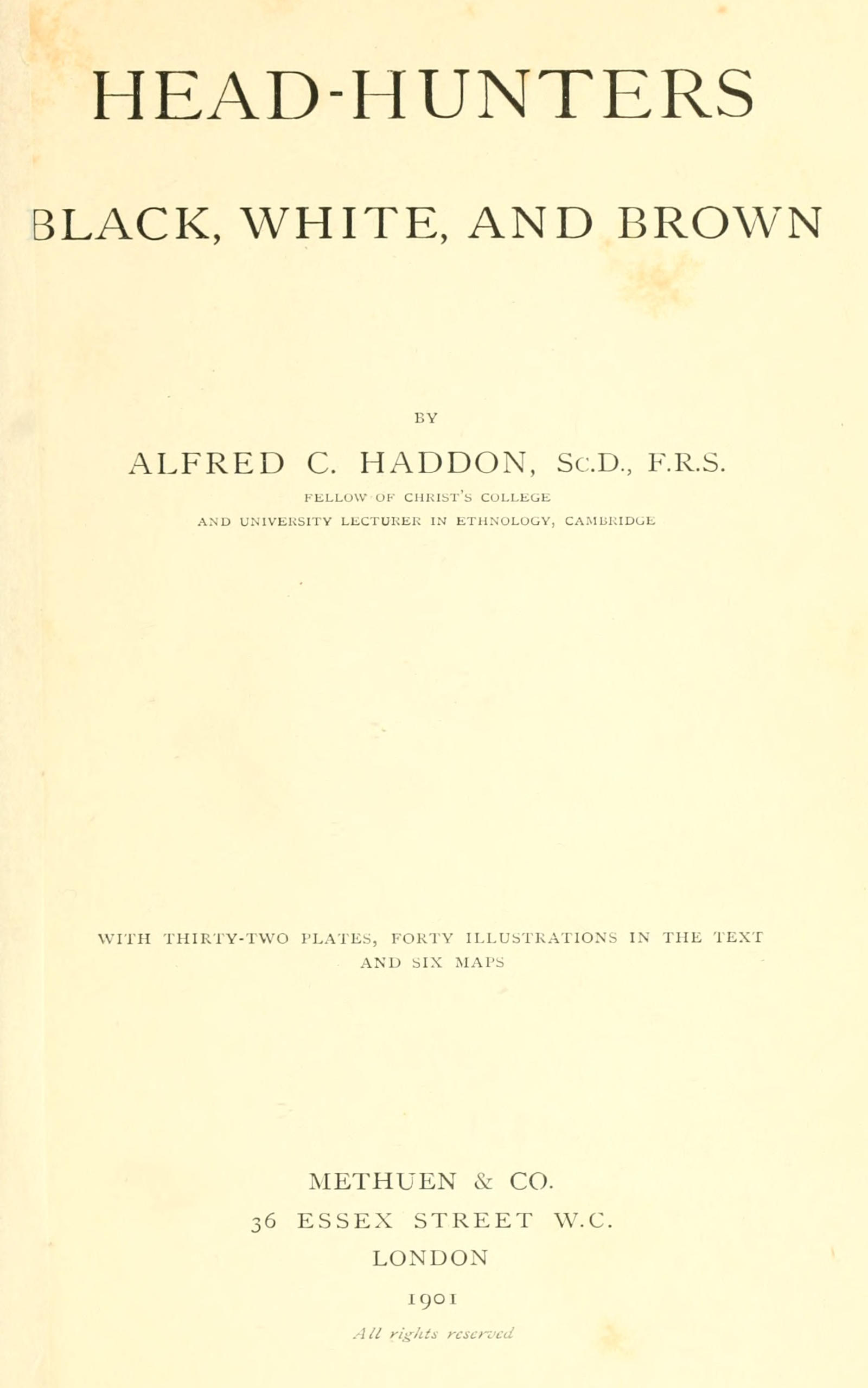 Such was the personnel of the expedition. Several preliminary communications have been published by various members; but the complete account of our investigations in Torres Straits is being published by the Cambridge University Press in a series of special memoirs. The observations made on the mainland of British New Guinea and in Sarawak will be published in various journals as opportunity offers.