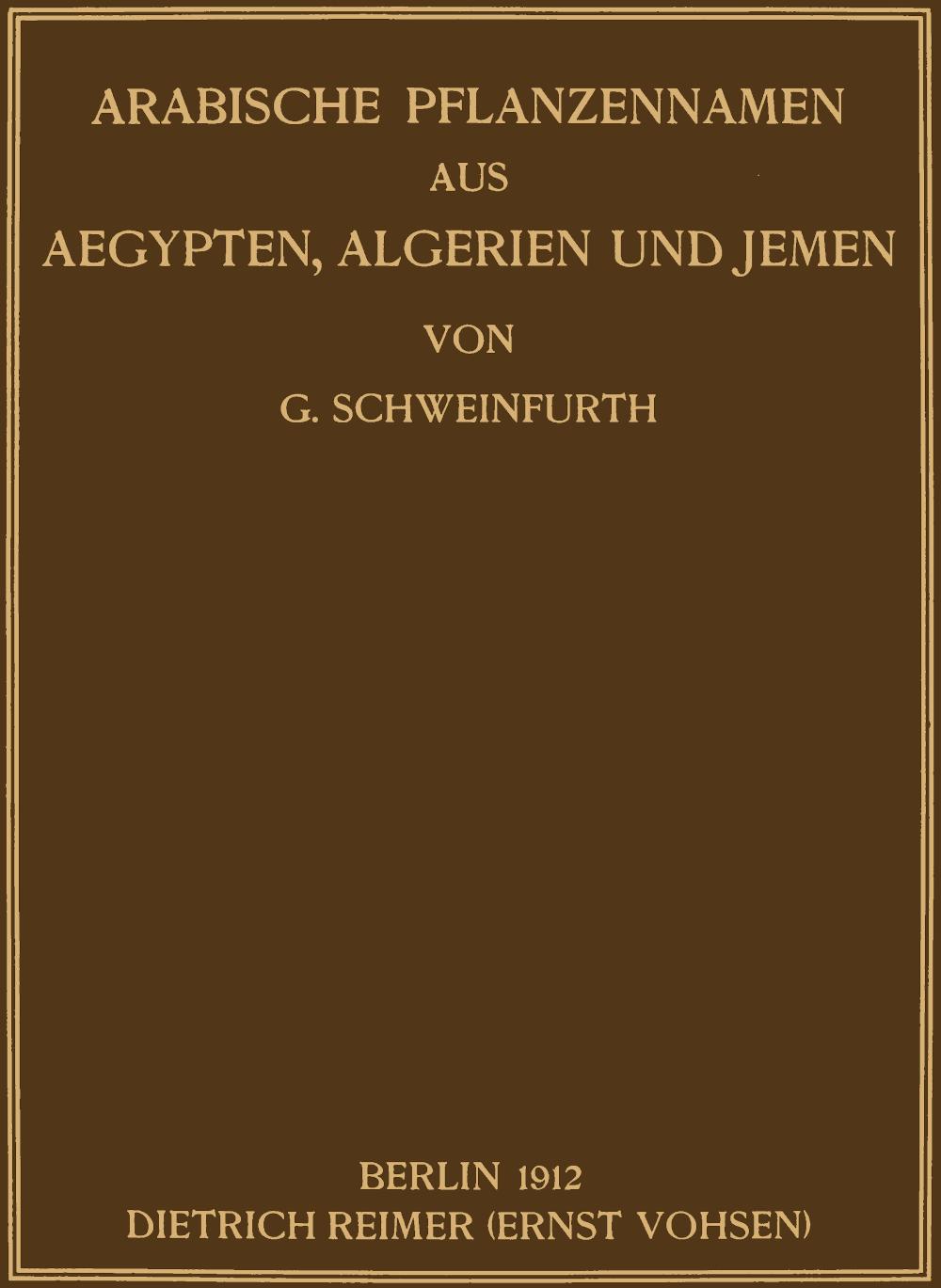 In unserer 1887 in den Denkschriften des Institut Egyptien zu Cairo veröffentlichten „Illustration de la flore d’Egypte“ sind in Gemeinschaft mit P. Ascherson von mir alle uns aus eigener Erfahrung sowie aus der uns zugänglichen, Aegypten behandelnden Literatur bekannt gewordenen arabischen Pflanzennamen, soweit sie für das eigentliche Aegypten Geltung hatten, eingetragen worden. Obgleich wir meist darauf bedacht waren,[XVI] bei den nicht von uns selbst erkundeten Namen durch Angabe der Gewährsmänner, denen wir sie entlehnt hatten, eine Prüfung ihrer Zuverlässigkeit zu ermöglichen, so war doch nach Maßgabe unserer damaligen Kenntnis und Erfahrung eine durchgreifende Kritik aller Namen und ein gegenseitiges Abwägen ihres Wertes ausgeschlossen.