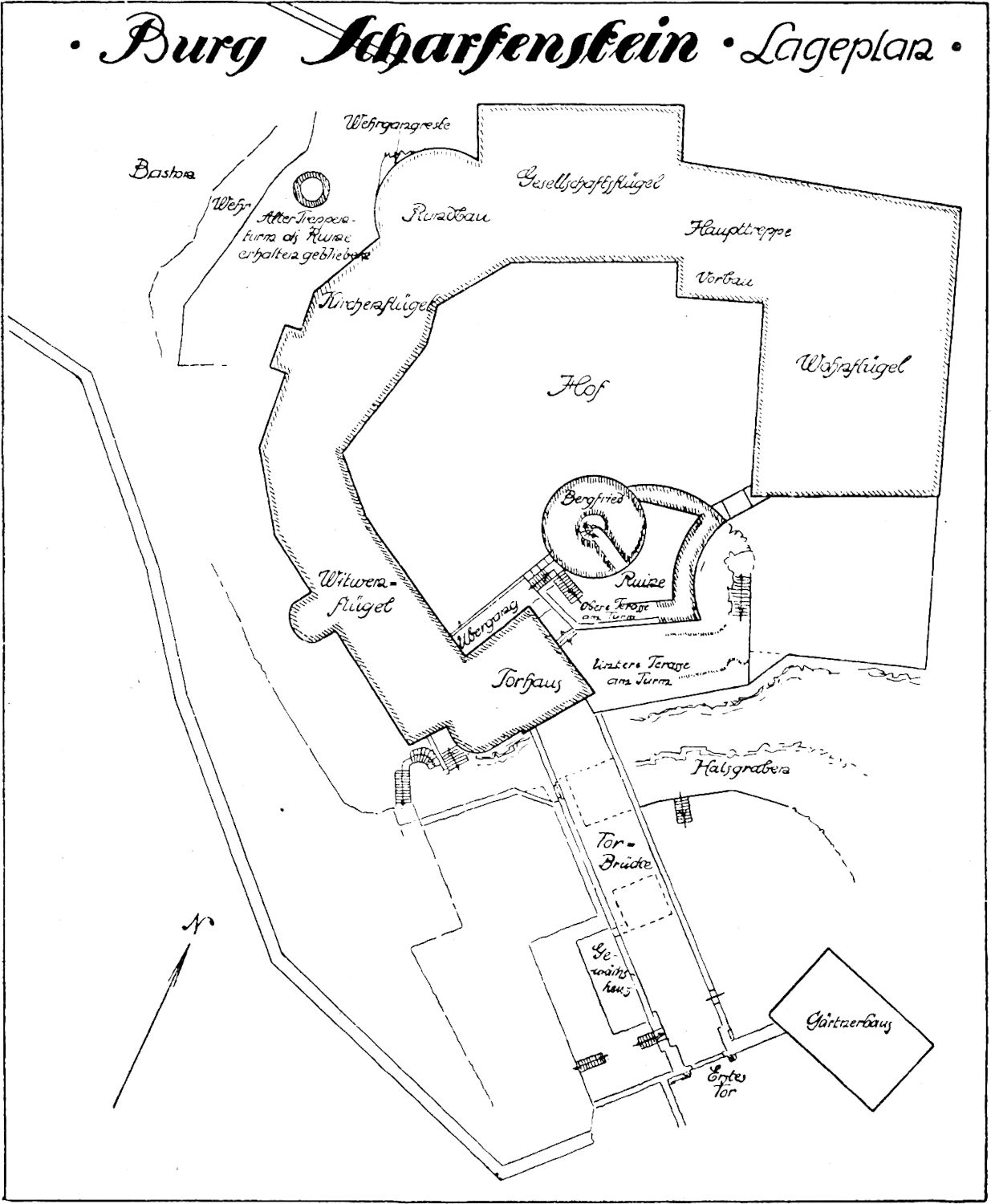 In Rücksicht auf eine so späte Entstehung der Burg Scharfenstein halte ich es auch nicht für wahrscheinlich, daß die Burg längere Zeit nur aus dem Bergfried und dem kleinen daran gelehnten Palas bestanden habe. Dazu waren die Bedürfnisse des ritterlichen Adels um 1250 oder gar um 1300 schon zu weit fortgeschritten. Auch scheint die Sicherheit der Burg die Befestigung der ganzen Plattform des Felsens gefordert zu haben. Demnach sind die jetzt bewohnten, den Burghof im Dreiviertelkreis umgebenden Gebäude wenigstens zum Teil wohl gleichzeitig mit dem Bergfried und Palas oder nur wenig später erbaut worden; sie bildeten, untereinander durch Wehrgänge verbunden, den sogenannten Zwinger. So kann man die Burg in ihrem heutigen Umfange als ein beinahe gleichzeitig entstandenes Ganzes auffassen. Einzelne nach Westen zu sich der Talsohle nähernde Steintürme, von denen noch Trümmer vorhanden sind, bildeten, durch unterirdische Gänge miteinander und mit der Burg verbunden, eine Ergänzung dazu, die als Verbindungsglied zu der im Tale hinführenden Straße oder als Fluchtburg bei Gefahr für die Einwohner des Dorfes von Wichtigkeit war.