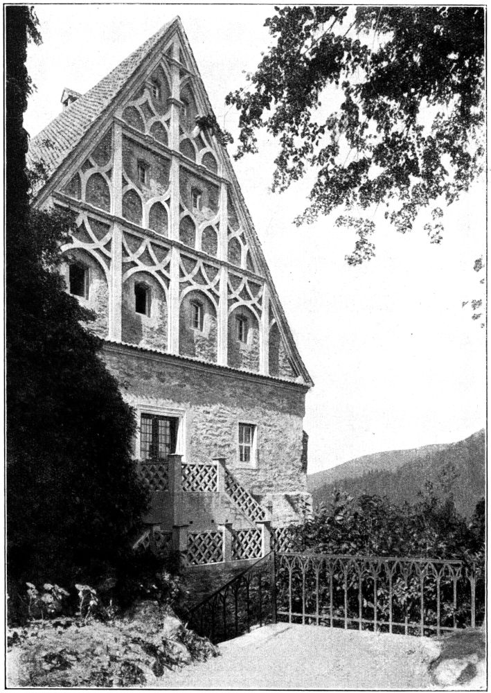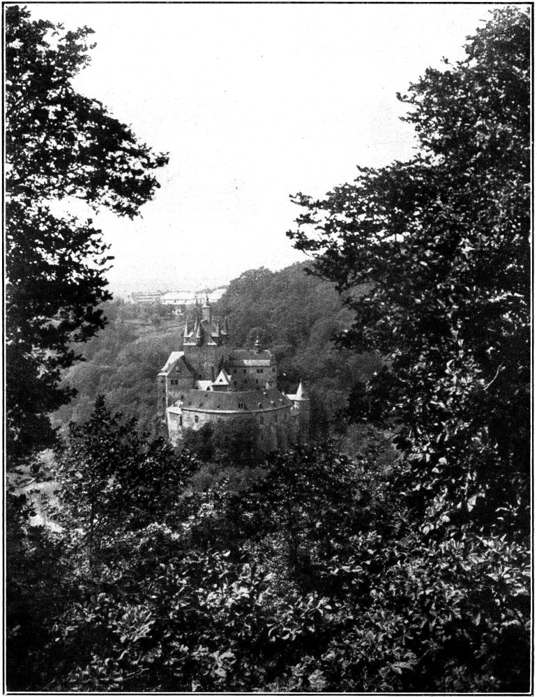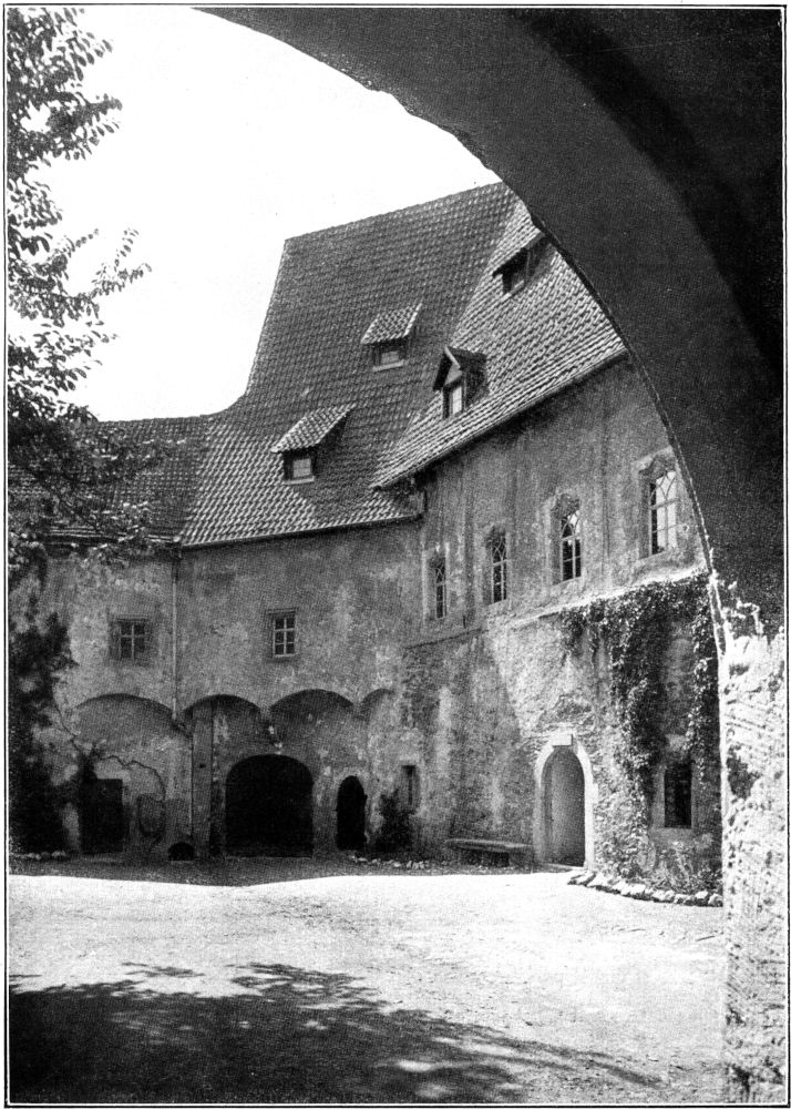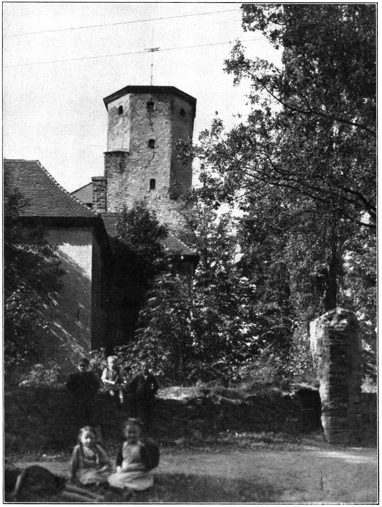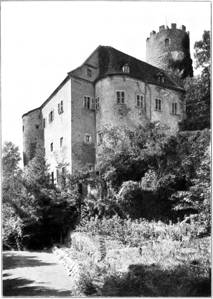 Später zeigte mir die Frau Gräfin noch die beim Brande größtenteils gerettete Bibliothek in einem Raume des Torhauses. Diese Bücherei hat allerdings durch das Feuer eine sehr anziehende Besonderheit verloren: den schön gebundenen Briefwechsel eines weltbekannten Liebespaares, eines zu Goethes Zeit am Weimarer Hofe lebenden Leutnants und Bergrats Johann August von Einsiedel – sein Bruder war der Weimarische Geheime-Rat und Oberhofmeister Friedrich Hildebrand von Einsiedel – und der Freifrau Emilie von Werthern-Beichlingen, die, um mit ihrem Geliebten entfliehen und eine Afrikareise antreten zu können, ihre Todesnachricht verbreiten und ein ihr gleichendes Wachsbild begraben ließ (1784). Andere wertvolle Schriftstücke aus dieser Zeit und aus dem Weimarer Kreise sind erhalten geblieben; ich sah Briefe von Wieland, Herder, Knebel, der Gräfin Tina von Brühl, Dorothea Schlegel u. a. Dann genoß ich die herbstliche Schönheit des vom Torhaus und Witwenflügel nach Westen zu liegenden Burggartens (Abb. 8) mit der alten Bastion, die einen herrlichen Blick ins Tal gewährt und umwanderte, soweit es der noch nicht völlig beseitigte Bauschutt gestattete, dicht am Mauerwerk hin die West- und[332] Nordseite der Burg von außen. Dabei sieht man erst, wie kunstvoll sich hier uraltes Mauerwerk und die neuen Flickarbeiten, alte Unterbauten und neue Oberbauten einander durchdringen. Als ich mich danach im Schlosse verabschiedet hatte und die Treppe des Wohnflügels hinunterstieg, schaute ich, ehe ich in die noch immer goldene und wärmende Herbstsonne hinaustrat, noch einmal zur Tür der Burgkapelle hinüber – und gedachte der Kinderschar, die in diesen Räumen getauft und erzogen, hoffentlich einmal ein glücklicheres Deutschland sehen wird als das heutige. Aber weder das heutige noch das künftige Deutschland möge die alten Wurzeln seiner Kraft und seiner Kultur vergessen.