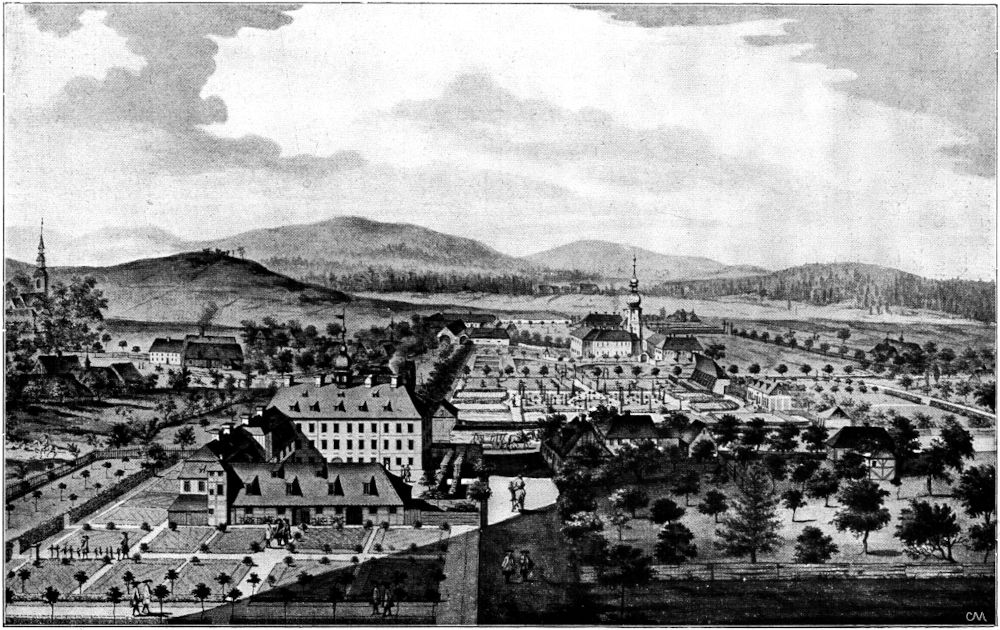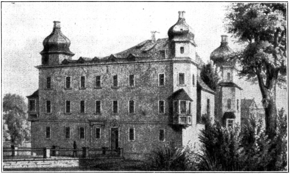 Hier öffnet sich sofort ein reizvoll malerischer Durchblick in den rechteckig umgrenzten kleinen Schloßhof, den an zwei Seiten Rundbogenhallen umrahmen und den einige sonnendurchleuchtete, herbstlich bunte Bäume beschatten (Abb. 4). Das Gesamtbild wird ursprünglich viel bewegter gewesen sein, als noch die oberen Galerien in Fachwerkbögen sich ebenfalls nach dem Hofe zu öffneten und Einblick in die Verbindungskorridore gestatteten, von denen aus auch die Festsäle des Obergeschosses zugänglich waren. Es sind deren zwei, die nebeneinander liegen und durch zwei Geschosse hindurchreichen. Heute sind sie ihrer Decken beraubt und anstatt auf barocke Deckengemälde in verschnörkelter Stuckfassung blickt das Auge in das offen[345] zutage liegende Gerippe des mächtigen Dachstuhles. Der sechsfenstrige Ecksaal mit seinen beiden Erkerausbauten bietet noch immer wunderschöne Fernblicke auf das Lausitzer Land, und wir hören gerne, wie der alte Führer berichtet, daß der junge Graf von Zinzendorf hier als Kind gespielt habe, betreut von der Frau Großmutter, der alten Exzellenz von Gersdorf. Hier hat er auch mit seiner jungen Gattin im Jahre 1722 geweilt, als er die ersten böhmischen Ansiedler auf seinem Grund und Boden am Hutberge, dem späteren Herrnhut besuchte. Hier haben auch vom 29. Juli bis 10. August 1748 die Sitzungen der vom Landesherren ernannten Kommission stattgefunden, die zu prüfen hatte, »ob die Lehre der Evangelischen Brüdergemeinden für übereinstimmend mit der Augsburger Konfession zu halten sei.«