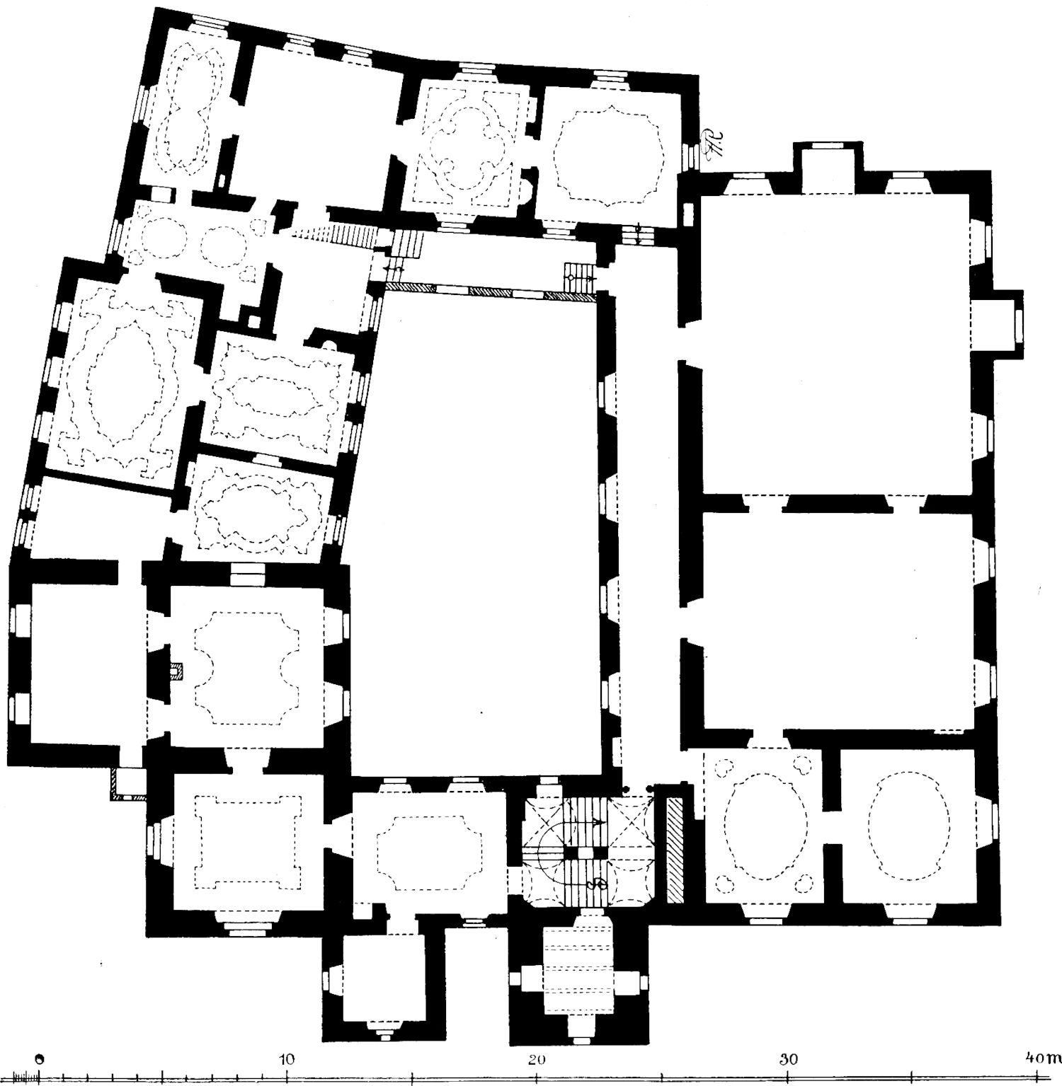 Rund um den kleinen Hof ziehen sich die gewölbten Wirtschaftsräume, die alten Ställe und Keller im Erdgeschoß, die großen und kleinen Kammern der Obergeschosse, nicht alle zu gleicher Zeit, sondern nach Bedürfnis nach und nach im sechzehnten bis achtzehnten Jahrhundert entstanden. Barock umrahmte, einfache Stuckdecken und Stuckkamine, Reste gemalter Tapeten sind alles, was von der Innenausstattung erhalten ist. Noch besteht eine reizvolle alte Wendeltreppe in einer Hofecke, noch ist die breitere Haupttreppe von der Eingangshalle beim Turme her begehbar (Abb. 5 Grundriß des Obergeschosses), aber nur wenige von den Räumen sind noch in wohnlichem Zustand und ein Zug des Verfalls geht durch das ganze Schloß.