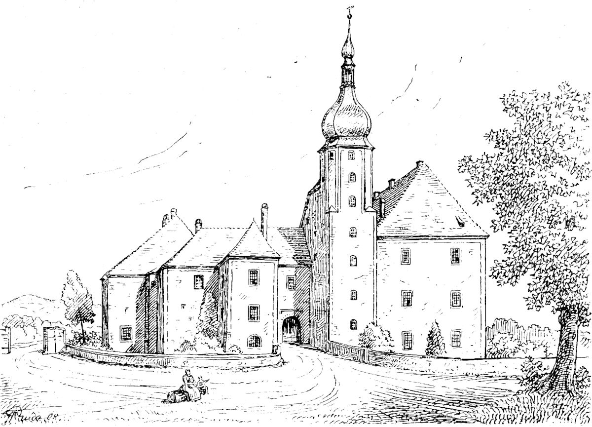Eine Tuschzeichnung vom Jahre 1755 (Abb. 6) läßt uns erkennen, wie das alte Schloß in seinen besten Tagen ausgesehen hat. Wir finden da im Mittelpunkte[346] des Bildes auch noch die graziöse, barocke Gartenanlage mit Orangeriegebäude, wie solche damals zu jedem besseren Schloßanwesen gehörte. Nur die völlig verbaute Orangerie und ein Rest des Gartentores, nebst einem Gartenhäuschen sind davon bis heute erhalten geblieben. Auch der große, im Bilde vorn links sichtbare Gebäudekomplex des alten Katharinenhofes hat längst schon einem Neubau weichen müssen.