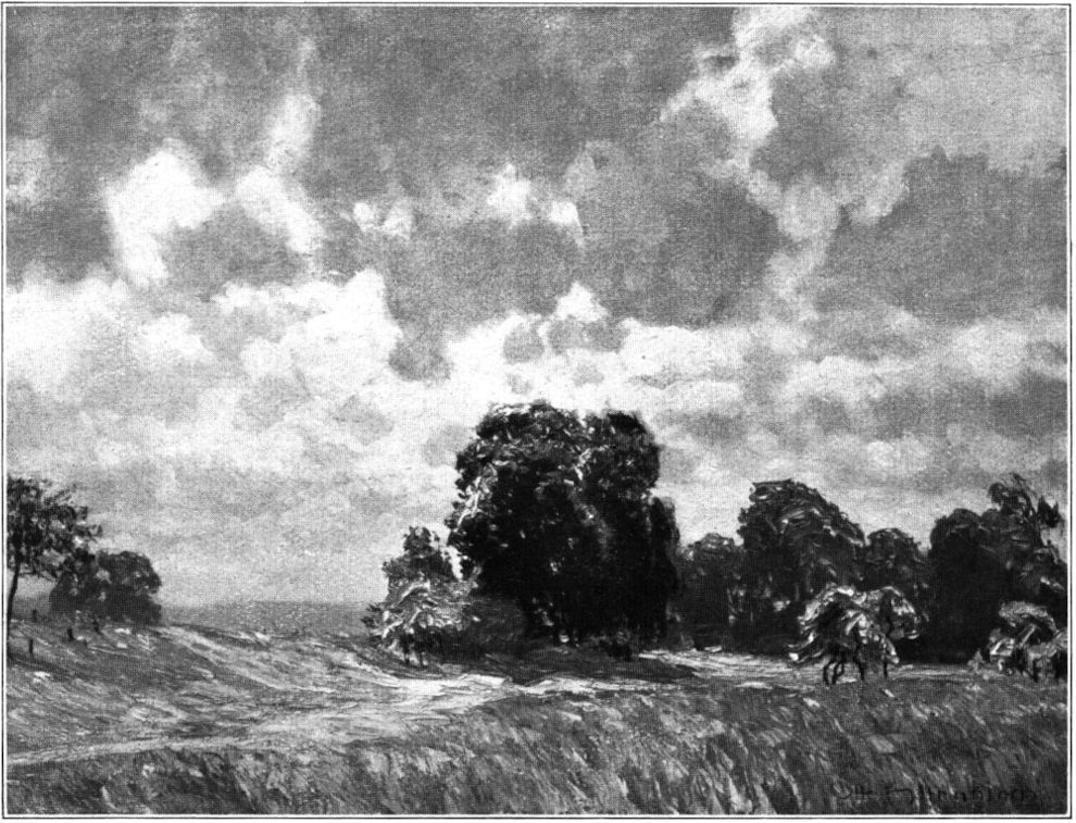 Der Heller flimmert in brandigem Dunst. Die Sandflächen breiten ein fahles Gelbgrau über den Vordergrund, von dem sich einige schmale Heidekrautinseln in trockenem Braunviolett mit vereinzelten grünen Flecken darin abheben. Weiter hinten streckt sich eine Windgrassteppe, weich wie Haar und kupfern in der Farbe, vor einem Waldstreifen, dessen Kiefernwipfel einer schweren Wolke gleich tief auf der Fläche zu liegen scheinen und nur am Rande, wo der Wald sich lockert, von einzelnen Stämmen wie von Stützen über der Erde gehalten werden. Über dem Walde steht hoch, prachtvoll, in einem stumpfen, dunklen Stahlblau eine Gewitterwolke wie ein riesenhaftes Haupt ohne Antlitz, von einer Aureole hervorbrechender Lichter umstrahlt. Sie steht regungslos, als warte sie noch, ehe sie mit rollender Donnerstimme in die Landschaft spricht. Unter diesem Wolkenhaupt drängt sich das bißchen Landschaft noch enger an die bleiche Erde. Nur eine Birke steht ganz allein mitten in der Sandfläche auf einem kleinen zerrissenen Teppich von Heidekraut. Ihr von vielen Stürmen verbogener Stamm, vor dem Stahlblau unwahrscheinlich weiß, überschneidet den fernen Waldstreifen und hält einen Laubbüschel wie eine zerfetzte Fahne hoch vor die drohende Wand.