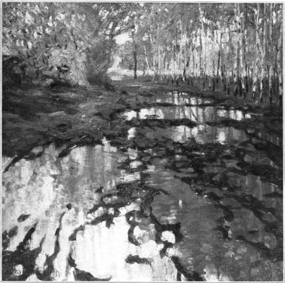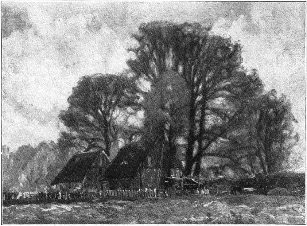 Meisterhaft ist seine Beherrschung der Luft. Sie umspielt alles Dargestellte auf seinen Bildern und gibt ihm die körperliche Erscheinung. Sie wird selbst zur Erscheinung. Sie rieselt durch das Goldlaub herbstlicher Birken, sie zittert über dem Sande in heißer Mittagssonne, sie liegt als feiner duftiger Schleier über der Ferne und hüllt kahle Bäume an trüben Tagen in melancholischen Flor. Ueber[371] morgenkühlen Wasserspiegeln steigt sie als silberner Atem auf und zwischen den feuchten Stämmen stimmungsschwerer Tauwetterlandschaften dampft sie als weicher Brodem. Wundervoll, nur in der Reproduktion leider nicht wiederzugeben, glitzert die geradezu kristallisierte Luft im Geäst der vom Rauhreif verzauberten Bäume. Man denkt an Alexander von Villers schönen Satz: »Die Sonne wäre außerstande, den dichtesten Busch im Walde so innerlich zu beleuchten, wie dieser Staub des Himmels es mit seiner weichen Ruhe vermag.«