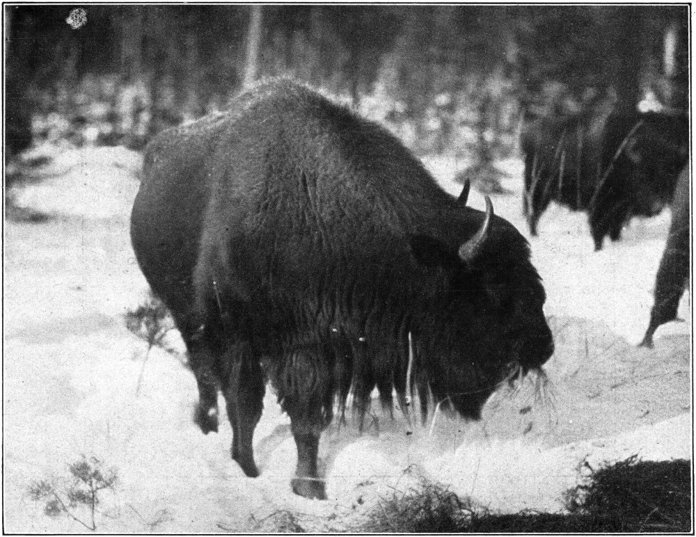 »Meine erste Begegnung mit dem Wisent erfolgte im Januar 1918, als ich von meiner Dienststelle im Westen zur Leitung photo- und kinematographischer Aufnahmen, die der Bund für Vogelschutz in Stuttgart vornehmen ließ, nach Bialowies beurlaubt worden war. Der erste Eindruck, den ich von den Tieren erhielt, enttäuschte allerdings etwas. Die Herde von siebzehn Stück, die auf einem Kahlschlag stand und der strengen Kälte und des hohen Schnees wegen von Zeit zu Zeit in Waldheu etwas Futter dargeboten erhielt, ließ wenig von der erwarteten[374] und den Tieren sonst auch eigenen Wildheit ahnen. Die Winterfütterung des Wisents war unter russischer Herrschaft zu einer alle gebotenen Grenzen überschreitenden Regel geworden und hatte das Wesen und die Natur der Tiere in der denkbar ungünstigsten Weise beeinflußt. Der Wisent war verweichlicht worden, und die dabei alle Scheu vor dem Menschen abgelegten Urwaldriesen muteten manchesmal fast wie halbzahme Stallrinder an. Diese große Vertrautheit wurde dem Tiere besonders in der Zeit der Besitzkämpfe um das Waldgebiet zum Verhängnis; sie machte den Abschuß spielend leicht und manch einer der Recken erlag der tötlichen Kugel, vor der ihm eine größere Scheu sicher bewahrt hätte[4]. Unter der deutschen Verwaltung war allerdings mit der bis dahin geübten Fütterungsweise gebrochen worden; die Tiere, die sich so sehr an die Fütterung gewöhnt hatten, daß sie unter russischer Herrschaft bereits im Oktober, wenn der Wald ihnen noch hinreichende Aesung bot, an den Fütterungsstellen sich einfanden[5], erhielten nur jetzt mehr ausnahmsweise bei strengster Kälte und tiefem Schnee in mäßiger Weise (zumeist in gefällten Weichhölzern: Aspen usw.) Futter dargeboten. Der Erfolg dieser Methode war ein guter; der Wisent wurde wieder zäher und ausdauernder und man wird Escherich Recht geben müssen, wenn er einen großen Teil der günstigen Erfolge der deutschen Hege, die die Ergebnisse der zarischen wesentlich übertrafen, auf diese Abkehr von der ehemals geübten Fütterungsweise zurückführt.