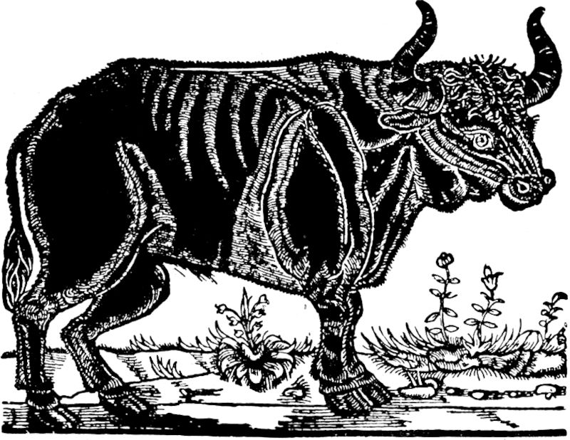 Die lange Zeit und bis fast in die Gegenwart hinein heiß umstrittene Frage, ob in Europa nur ein oder zwei Wildrinder vorgekommen sind, ist heute endgültig entschieden; wir wissen, daß zwei: der Ur und der Wisent, noch in historischer Zeit hier nebeneinander lebten. Neben aufgefundenen Resten des Ures, der sich bis ins siebzehnte Jahrhundert hinein am längsten in Polen gehalten hat, besitzen wir auch einige alte Abbildungen von ihm[7], die uns aufs überzeugendste die grundlegenden Unterschiede zeigen, die ihn von seinem Vetter, dem Wisent, trennten.