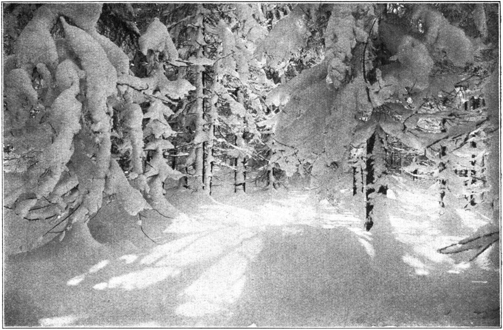 Am anderen Morgen, in aller Herrgottsfrühe, geht’s empor zum Gipfel des Aschberges. (Abb. 3.) Winterpracht! Rauhreif liegt über den Höhen. Jede junge Fichte eine Kristallkrone, jede Kiefer ein Gespenst, jedes Wacholderbäumchen eine[390] duftigzarte Filigranarbeit. Alle Formen einseitig verzerrt. Die dünnen Stangen des Wildgatters sind zu breiten Brettern, die Bretter zu Balken geworden. Am Boden ragen die starren Stengel des Wegerichs, die buschigen Schäfte der Schafgarbe und zierlich mit Eisnadeln besetzte Dolden über die Schnee-Ebene. An der unbewaldeten Seite des Gipfels ziehen zahllose parallele Skifahrerfährten geradlinig dahin. Die glatten Felsen des Kulminationspunktes mit der Triangulierungssäule (939,5 Meter) sind an der Wetterseite mit gewellten Eisplatten bekrustet. Von Böhmen herüber schieben sich Nebelschwaden vor und geistern zwischen einseitig bereiften Fichtenstangen. (Abb. 4.) Und nun steuere ich weglos nach der Senke zwischen Aschberg und Großem Rammelsberg, um bei Grenzstein 624 die von Obersachsenberg nach Morgenröthe führende Waldstraße zu erreichen. Die Nebelfetzen wachsen an zu Wolkenbalken, und da die von Schneemassen überwuchteten Grenzsteine kaum erkennbar sind, ist größte Aufmerksamkeit erforderlich. Trotz der frühen Morgenstunde ist die Waldstraße belebt von Skifahrern, die auf leichten Brettern nach der rechts des Weges gelegenen Kurt-Seydel-Sprungschanze gleiten. Der mächtige Holzbau, heute überzuckert mit Rauhreif und Neuschnee, wurde 1923 vom Wintersportverein »Aschberg« errichtet und bietet prächtige Blicke hinab ins Tal und empor zu den Waldhängen des 962,7 Meter hohen Rammelsberges. Ich aber biege links ab und folge den blauen Zackenzeichen des Erzgebirgskammweges bis zur Staatsstraße »Klingenthal–Auerbach« (Abb. 5). Im »Buschhaus« zu Mühlleithen halte ich Mittagsrast und breche, um vor Anbruch der Dämmerung den Abendzug in Muldenberg zu erreichen, zeitig auf. Mein Nachmittagsziel ist der 941,3 Meter hohe Kiel. Es ist dies kein eigentlicher Berg, sondern ein Gebirgsstock, der sich in einer Gesamtflächenausdehnung[391] von fünfundzwanzig Quadratkilometern stufenförmig aus den Tälern des Steinbaches, der kleinen Pyra, der Boda, des Sau- und Silberbaches, also im Wasserscheidengebiet Mulde–Eger, aufbaut und von einem Vasallenkranz von zwölf Vorbergen umgürtet wird. Das Aschberggebiet mit seiner dichten Besiedelung, mit seinen Skihütten und Sprungschanzen tritt von Jahr zu Jahr mehr aus seiner Wintereinsamkeit heraus. An klaren Wintersonntagen wimmeln seine Hänge von skifahrenden Naturgenießern. Am Kiel, bei Winselburg und um den Schneckenstein, steht schweigend der weite Winterwald. Der Massensportbetrieb konnte hier noch nicht festen Fuß fassen. Es fehlen die waldlosen, geneigten Flächen, und wenn auch hier und da zwischen weitständigem Hochwald eine Blöße lagert, so gibt es am Kiel doch zu viele Fichtendickungen, die dem[392] Sportsmanne das Fortkommen erschweren. Und doch lockt mehr als eine breite Schneise den Fahrer zu Tal. (Abb. 6.) Weite Fernsichten lassen die Höhenwanderer nicht los, obwohl schon dämmerig lange Baumschatten über den Weg huschen.