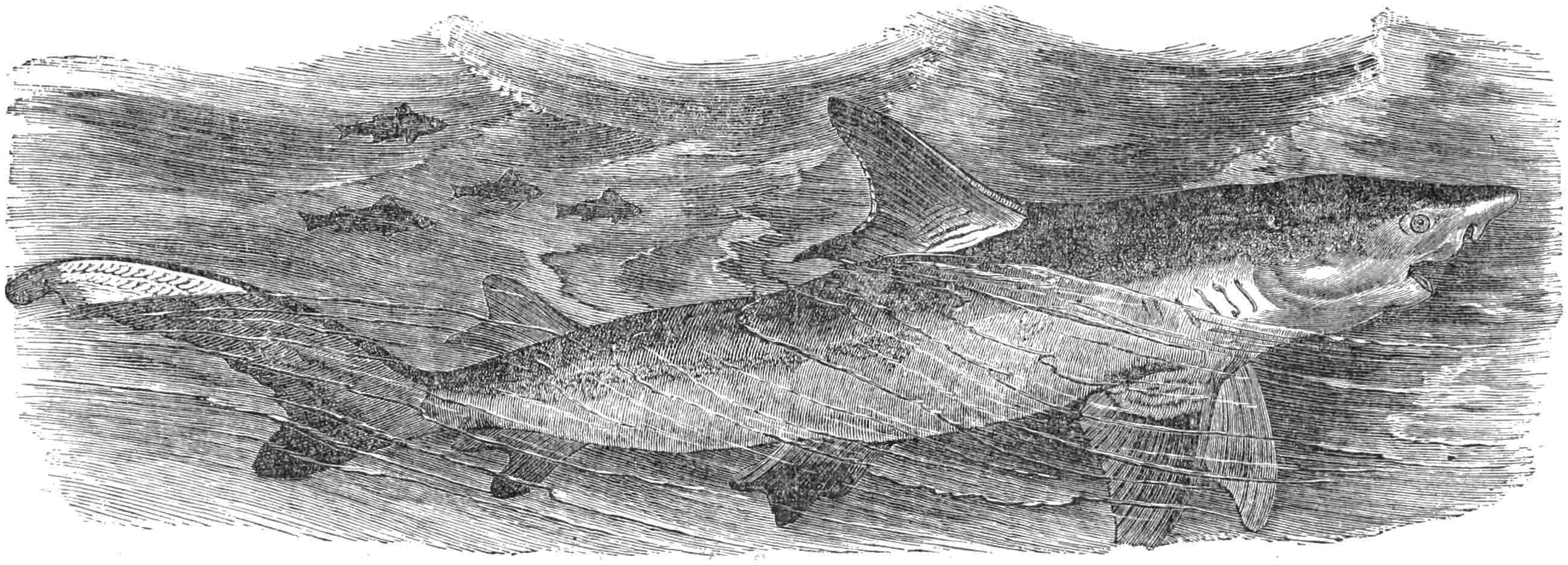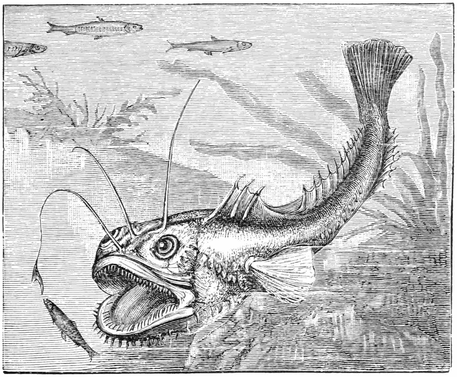 | Frontispiece. Fish of the Deep Sea—1. Chauliodus, one foot long; 2, 9, 10, 11. Harpodon or Bombay Duck, six inches; 3. Plagiodus, six feet; 4. Chiasmodus, one foot, with Scopelus in its stomach; 6. Beryx, one foot and a half; 8. Scopelus, one foot. | |