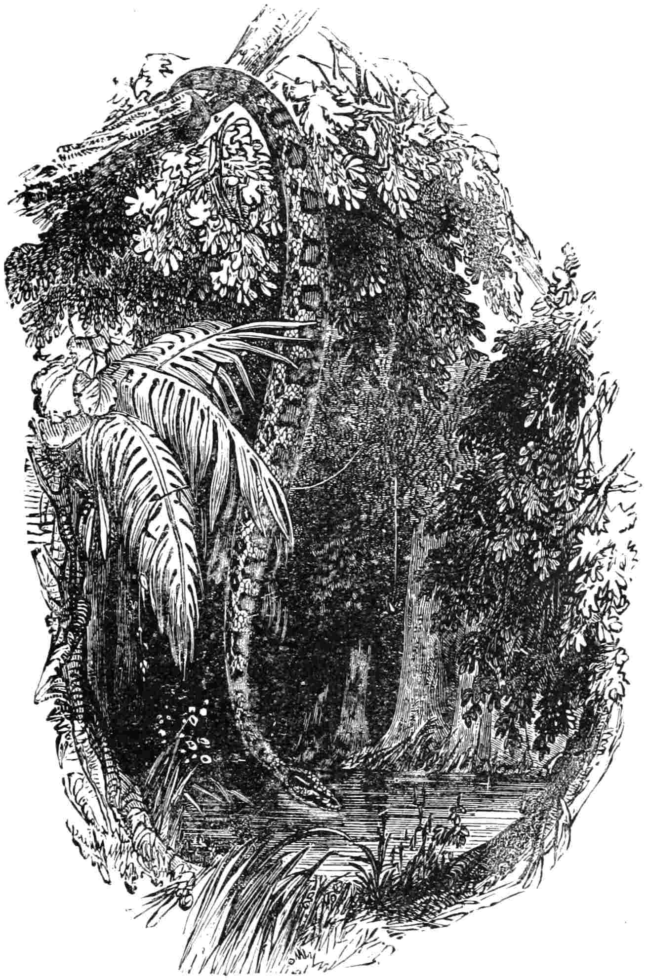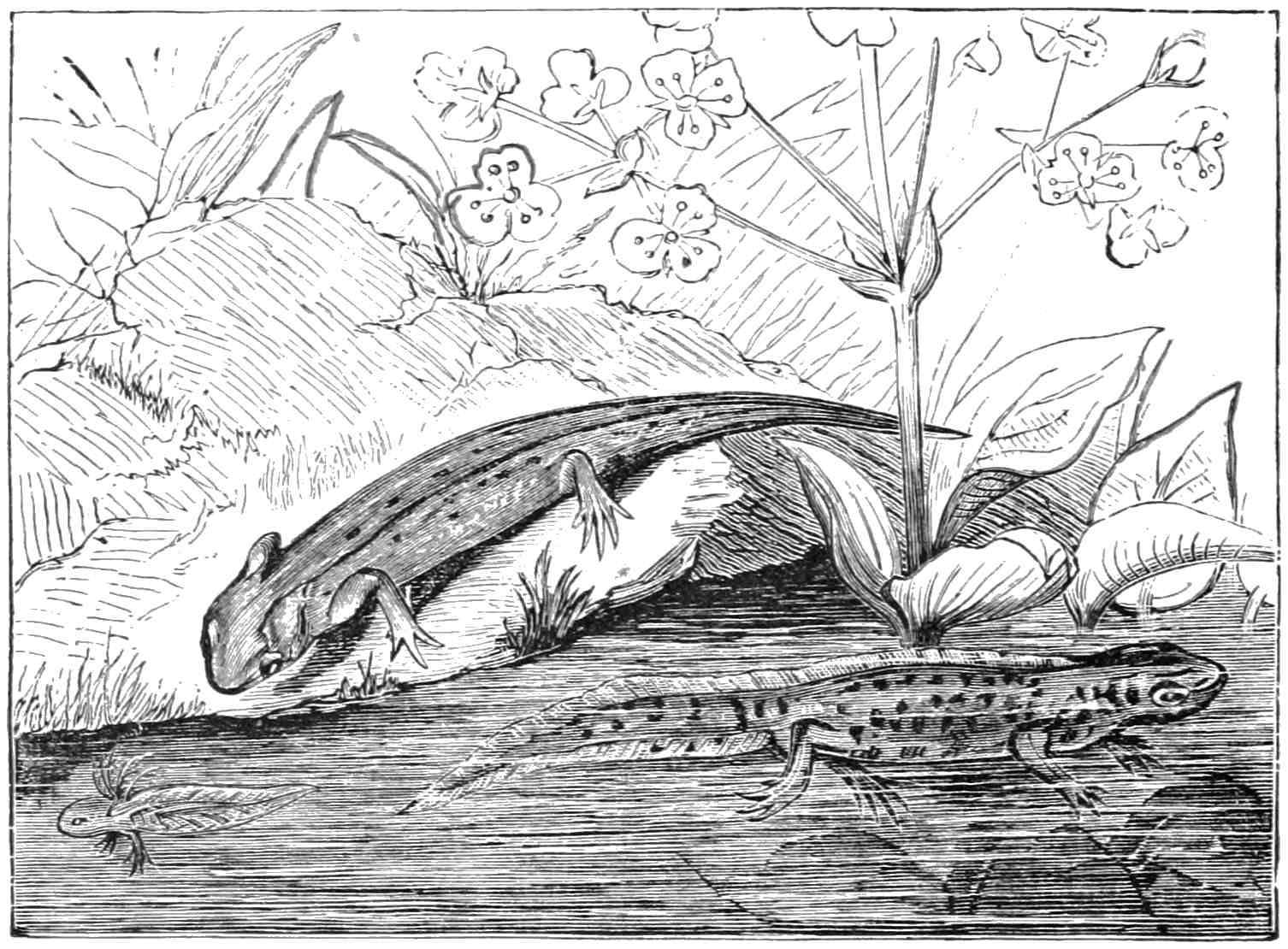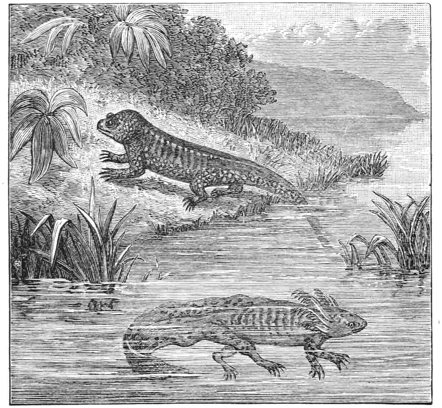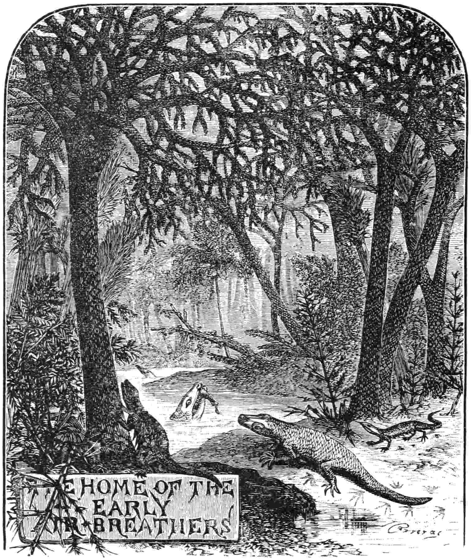 | Picture-Heading—A Carboniferous Forest with ancient Amphibians (Labyrinthodonts). In the water Baphetes; on land Dendrerpeton, Hylonomus, and Hylerpeton. (Animals taken from Dawson’s Air-Breathers of the Coal.)x | |