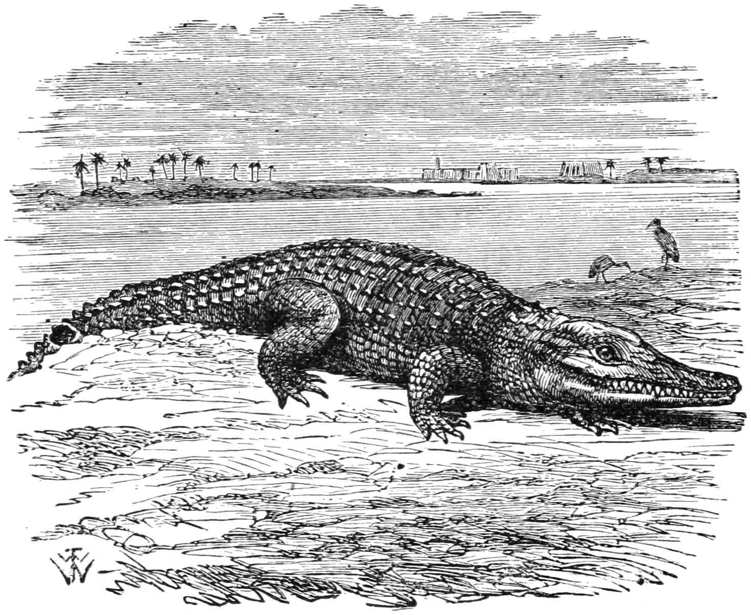 | Picture-Heading—Reptiles of the Cretaceous Period. On land Iguanodon, 20 feet high, attacked by Megalosaurus; in the air Pterodactyls, or flying lizards; in the water Ichthyosaurus, Mosasaurus, and Teleosaurus, with Plesiosaurus in the background. (From various sources.) | |