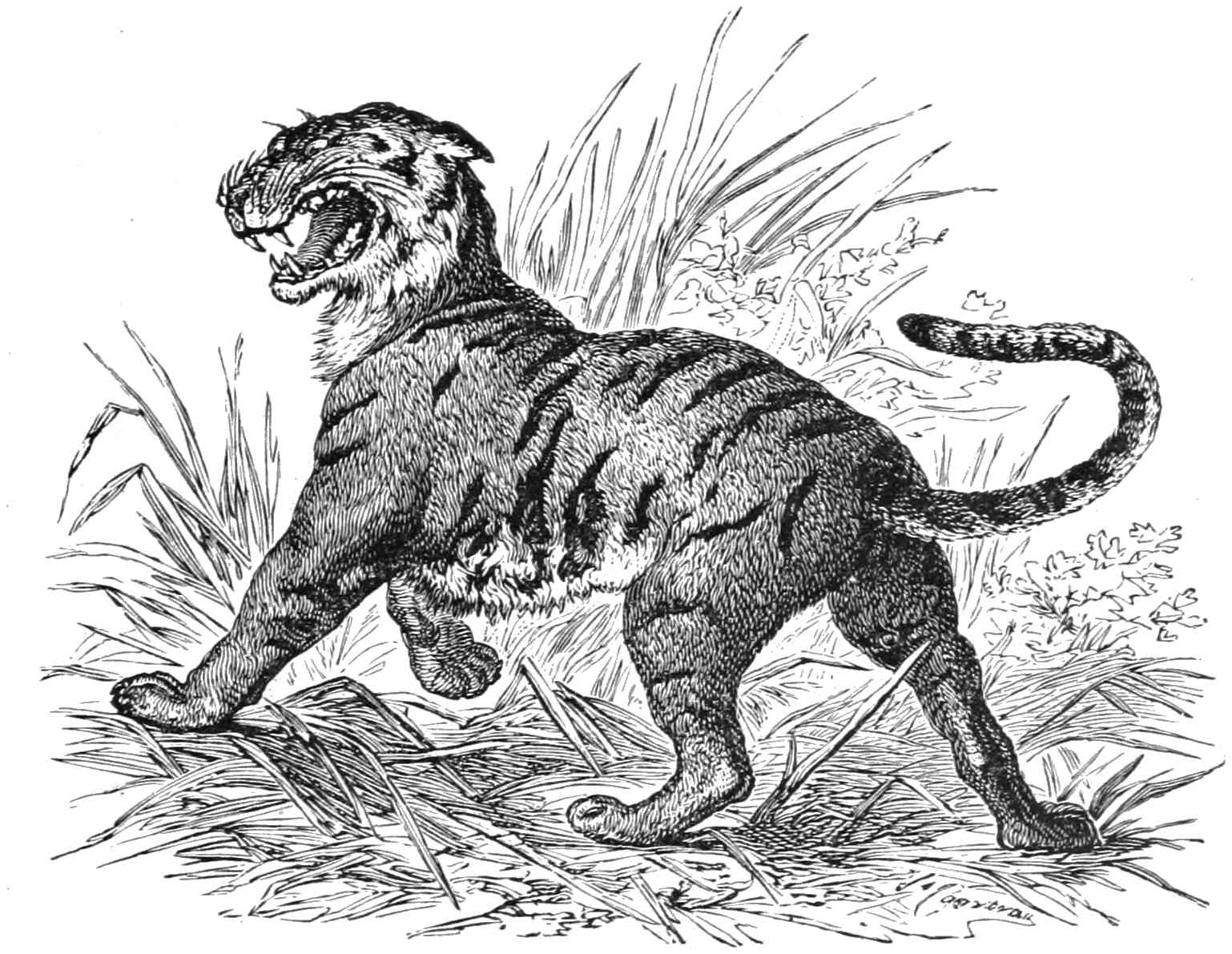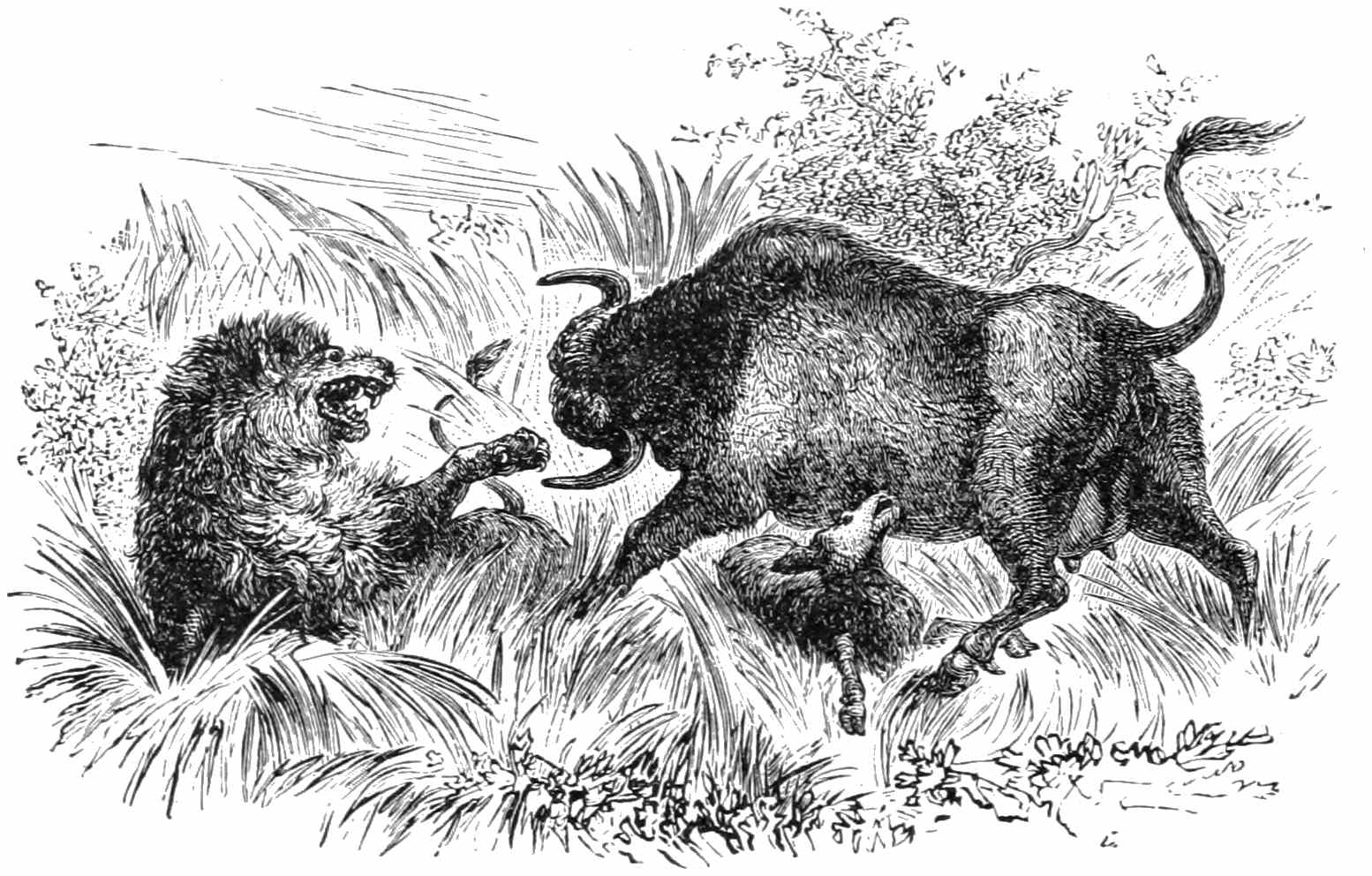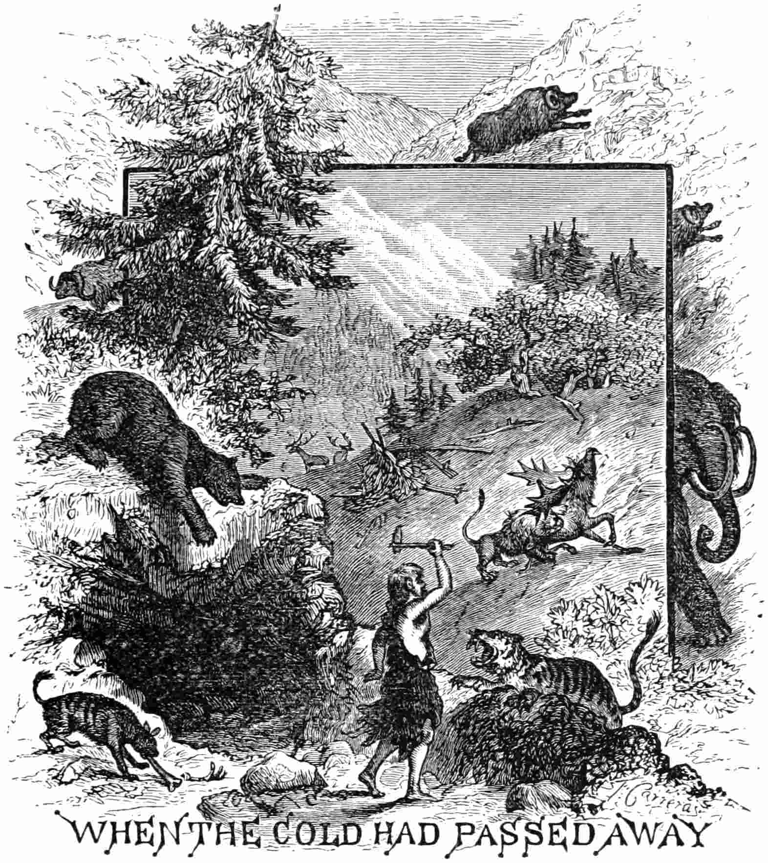 | Picture-Heading—Man as he lived in caves after the Glacial Period, among animals of species many of them now extinct—the cave bear (Ursus spelæus), cave lion, cave hyæna (Hyæna spelæa), elk, musk-sheep (Ovibos moschatus), mammoth (Elephas primigenius), and the sabre-toothed tiger (Machairodus), fighting with the man. | |