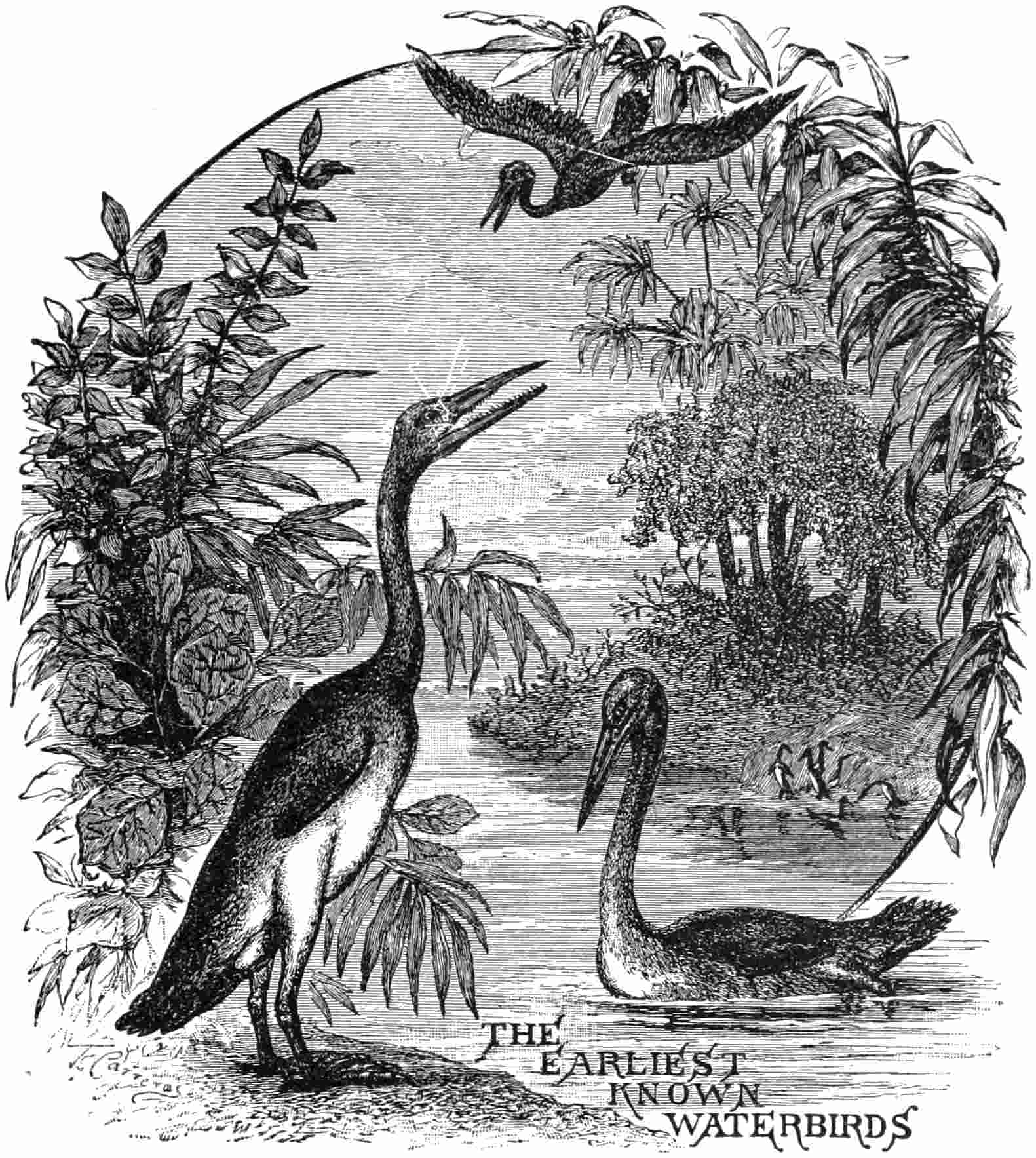 | Picture-Heading—Toothed Water-birds of the Cretaceous Period. Swimming and standing, Hesperornis; flying, Ichthyornis. (Restored from Marsh’s Skeletons.) | |