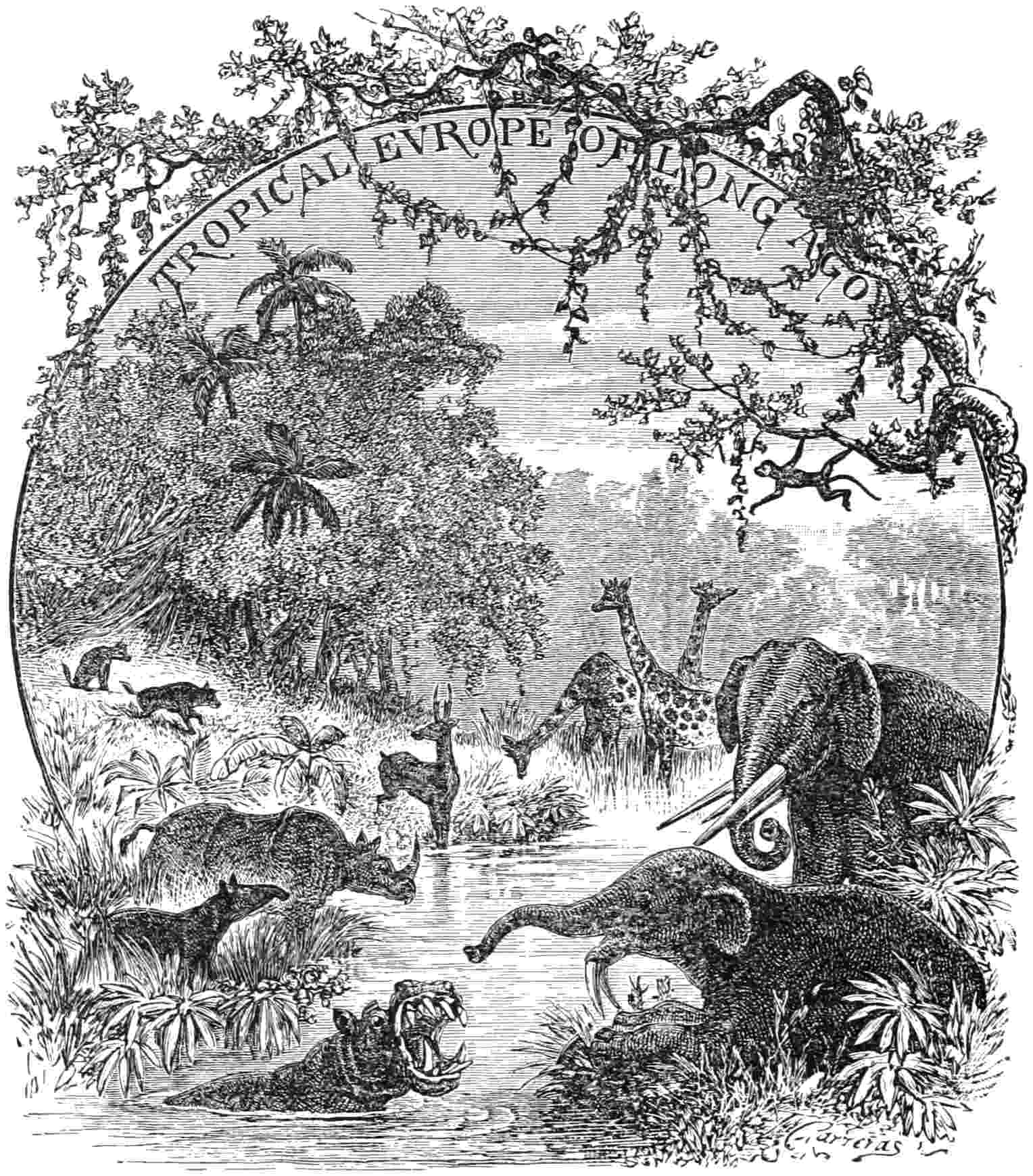 | Picture-Heading—Animals which lived in Europe during the warm periods before the Glacial Cold. On the right, Deinotherium, Mastodon; in background, Helladotherium, ancient giraffes; on the left, Hippopotamus, Tapir, Rhinoceros, Hyæna; in the tree, Pithecus pentelicus. All these animals, except the giraffe, were living in England in the late Tertiary Period. (From various sources.) | |