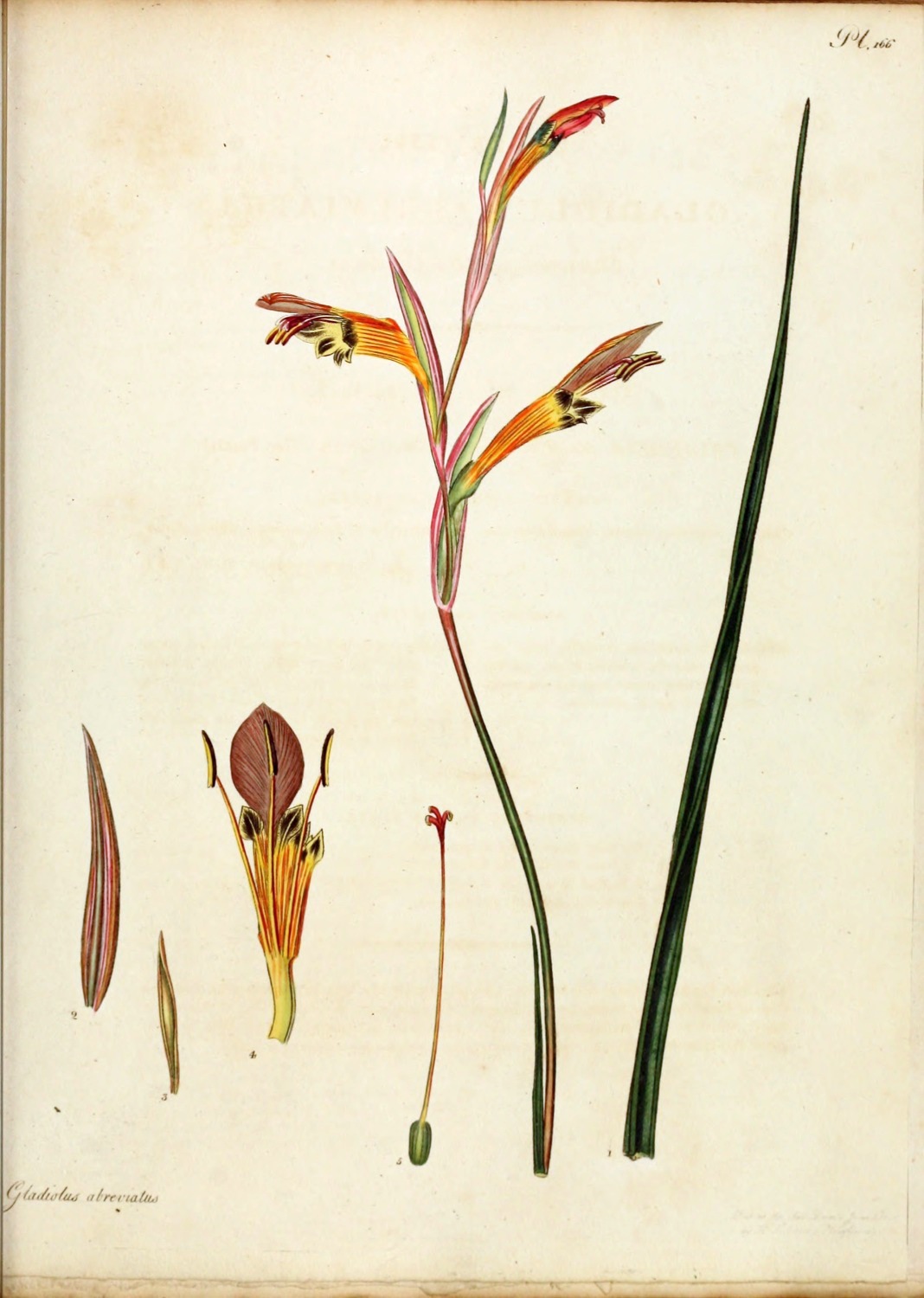 | 219 | Gladiolus cuspidatus, Var. petalis crispis | Spear-spotted Gladiolus, V. with crisped petals | G. H. | Bulb. | May. | |