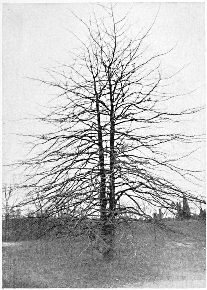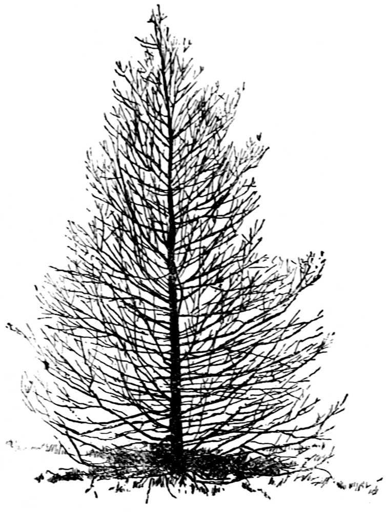 At one time in England the plan of introducing [Pg 189]the larch into the forests bordering the English lakes was under consideration, and this greatly disturbed the poet Wordsworth, who was keenly alive to the distressing effects of inharmonious and inappropriate tree planting. In “A Description of the Scenery of the Lakes,” he points out the fact that it is impossible for trees which terminate in a spike, like that of the larch, to blend together and form masses of wood; that if thousands to tens of thousands are added, the appearance is still the same, a collection of separate individual trees, obstinately presenting themselves as such, and which, from whatever point they are looked at, if but seen may be counted upon the fingers. He goes on to express his dislike of the larch in the following words “As a tree it is less than any other pleasing; its branches (for boughs it has none) have no variety in the youth of this tree, and little dignity even when it attains its full growth; leaves it cannot be said to have, consequently it affords neither shade nor shelter. In spring the larch becomes green long before the native trees, and its green is so peculiar and vivid that, finding nothing to harmonize with it, wherever it comes forth a disagreeable speck is produced. In summer, when all other trees are in their pride, it is[Pg 190] of a dingy, lifeless hue; in autumn of a spiritless, unvaried yellow, and in winter it is still more lamentably distinguished from every other deciduous tree of the forest, for they seem only to sleep, but the larch appears absolutely dead.”