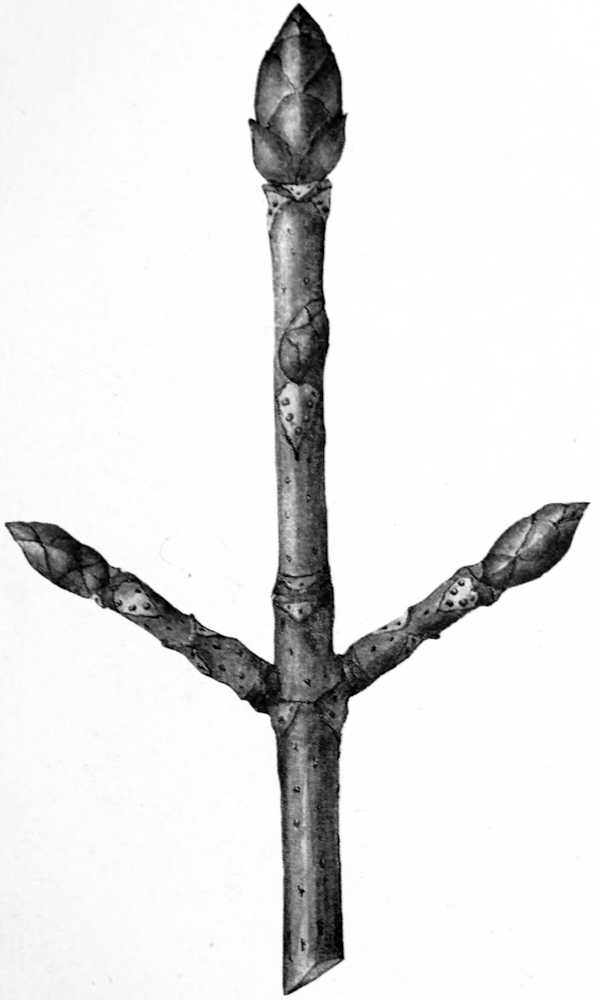 A large tree, 60 to 80 feet high, with smooth greenish gray bark. The buds are conical with somewhat downy scales and spread at right angles from the stem. Slender twigs and alternate leaf-scars.