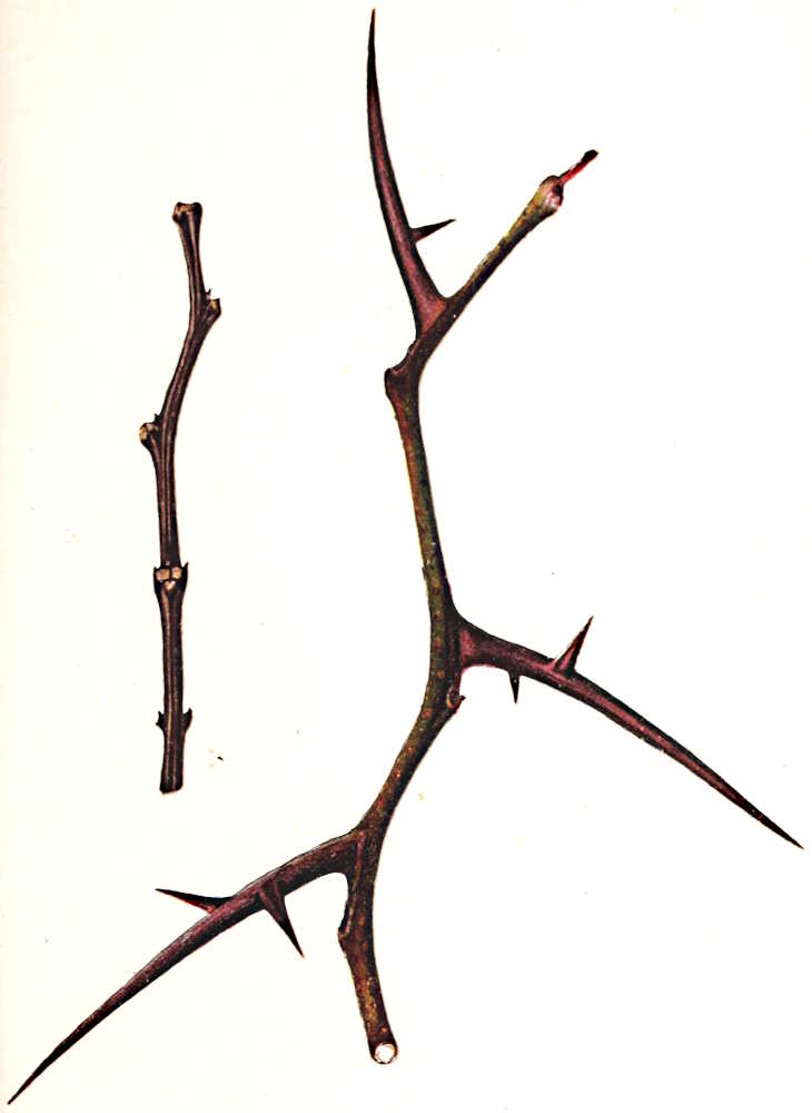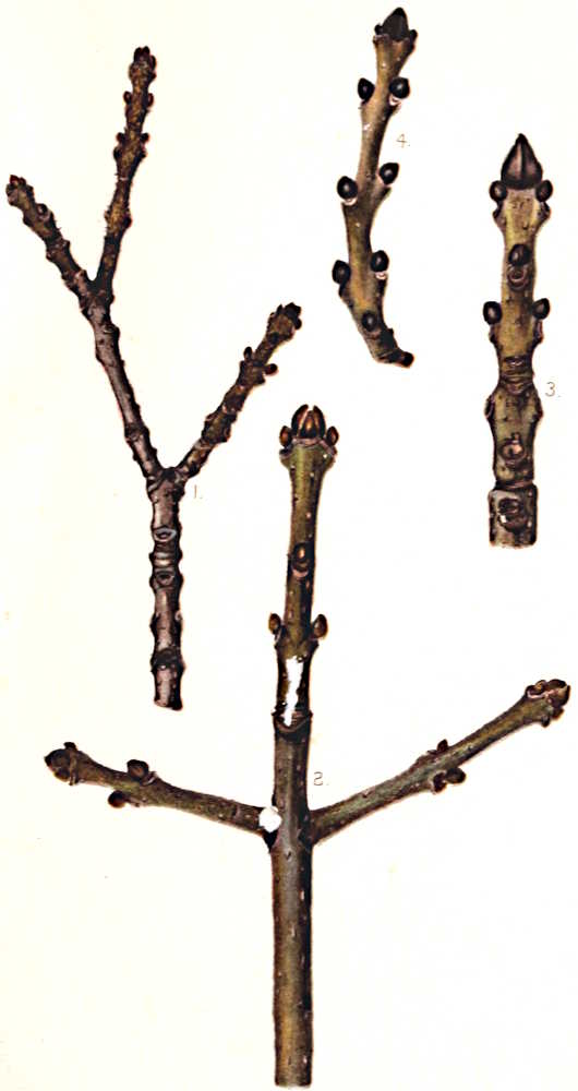 A pyramidal tree, 30 to 70 feet high. The bark is smooth, and the branches incline to be thorny, especially when the tree has escaped cultivation. Smooth stems and small pointed buds. Alternate inconspicuous leaf-scars, with three bundle-scars.