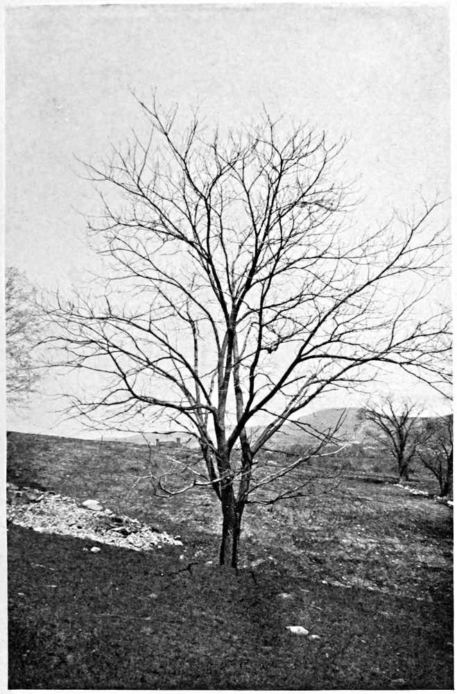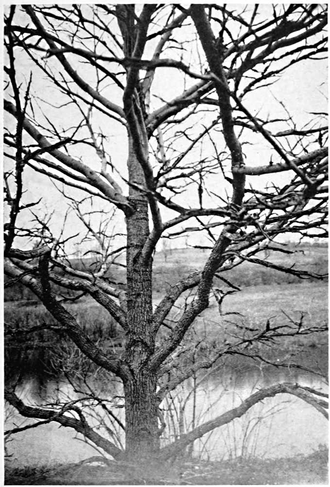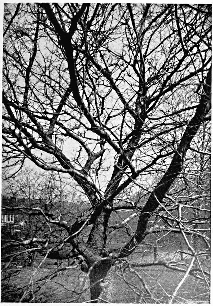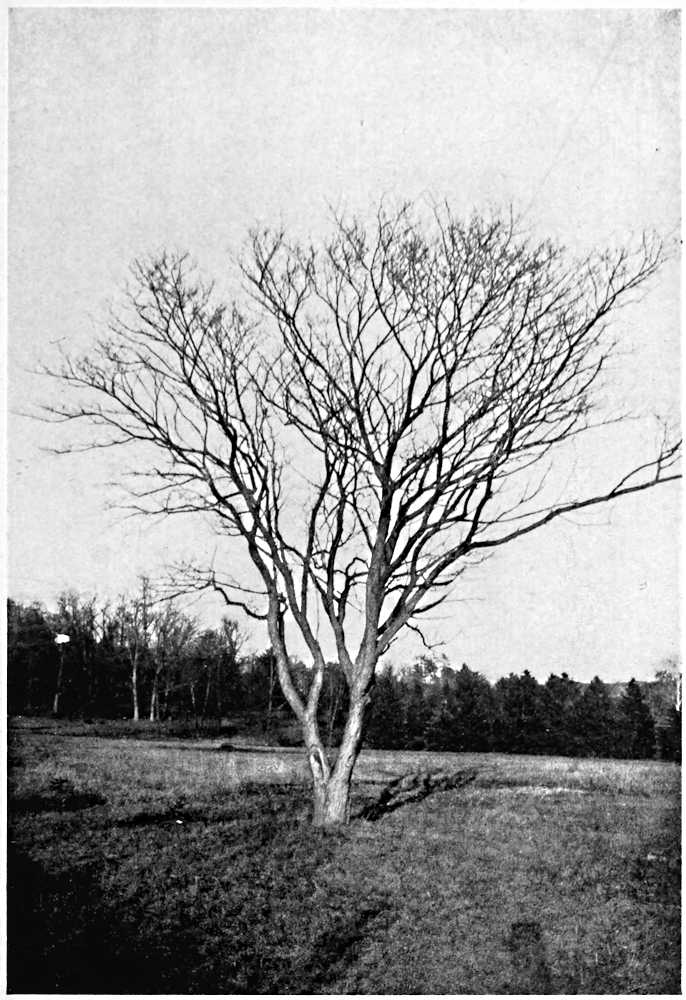 The low, flat-topped, broad-headed shape of the apple tree is so characteristic that it may be easily recognized in winter, even when there is no surrounding orchard to identify it. So strong in one’s mind is the association of blossoms with these trees, that even a bare old apple tree against a winter sky suggests the spring,—an apple tree always seems to be haunted by the ghosts of its pink blossoms. The literary history of this tree goes back to the mythologies of the Greeks, the Scandinavians, and the Druids, and it also figures prominently in early Christian as well as pagan legends. It has been cultivated for its fruit since prehistoric times, and there are hundreds of varieties of it in cultivation.