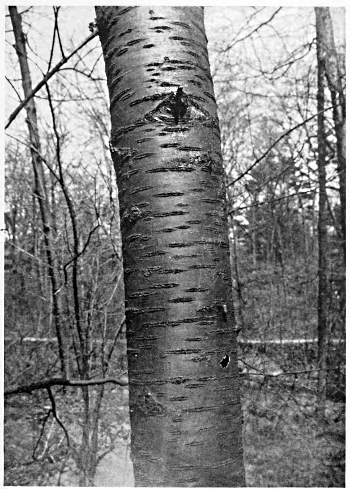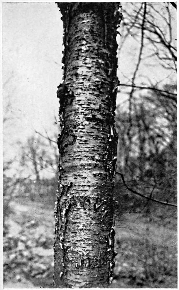 The black cherry may be identified in winter by its bark and by the disagreeable bitter taste of its stems,—no other tree has a strong, peculiar, pungent taste like this. The bark of the young trees is really beautiful, it is so smooth and has such a rich reddish brown color; in some characteristics it resembles that of the black birch, but the larger, coarser lenticels distinguish it from that tree.