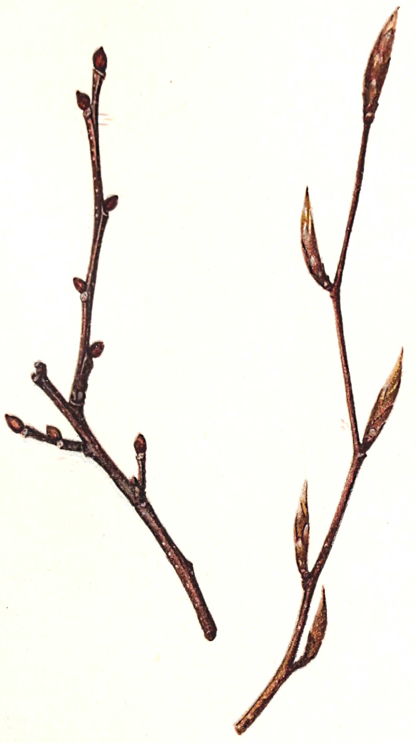 A small tree, 40 to 50 feet high, with smooth brown bark. Slender twigs. The buds are brown and covered with slightly downy, silky scales, and the leaf-scars are alternate.