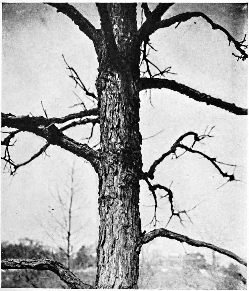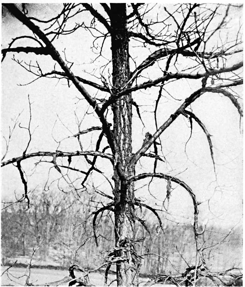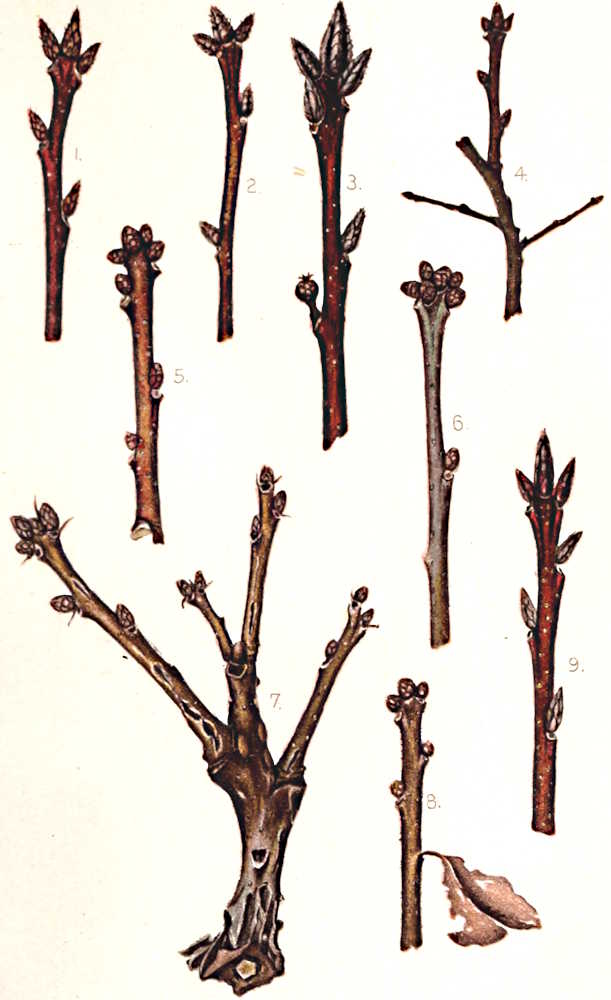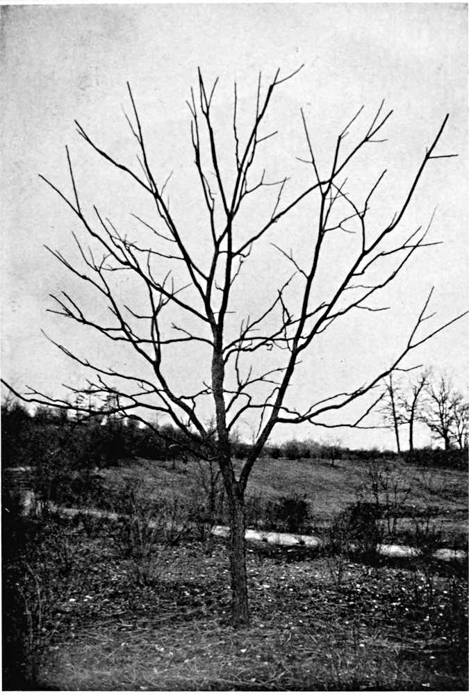 The cherry was brought from Asia to Italy,[Pg 173] and from there it was rapidly carried to all parts of Europe. The peach came originally from China, and was brought to Great Britain by the Romans, who got it from Persia during the reign of the Emperor Claudius. It was carried to North America by the first settlers at the beginning of the seventeenth century. The difficulty of raising peaches successfully in the Northern States is not so much due to the cold weather as to the swelling of the buds on warm winter days and in the early spring, which are afterwards destroyed if the thermometer goes below zero. An interesting experiment of whitewashing peach trees, to prevent the buds from absorbing heat on sunny days, was tried by Mr. Whitten of the Missouri Experiment Station, and it was found that whitened buds remained dormant until April, while unprotected buds swelled perceptibly in February and March. Eighty per cent of whitened buds passed the winter safely, where only twenty per cent of unwhitened buds escaped injury by premature swelling.