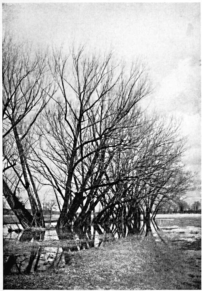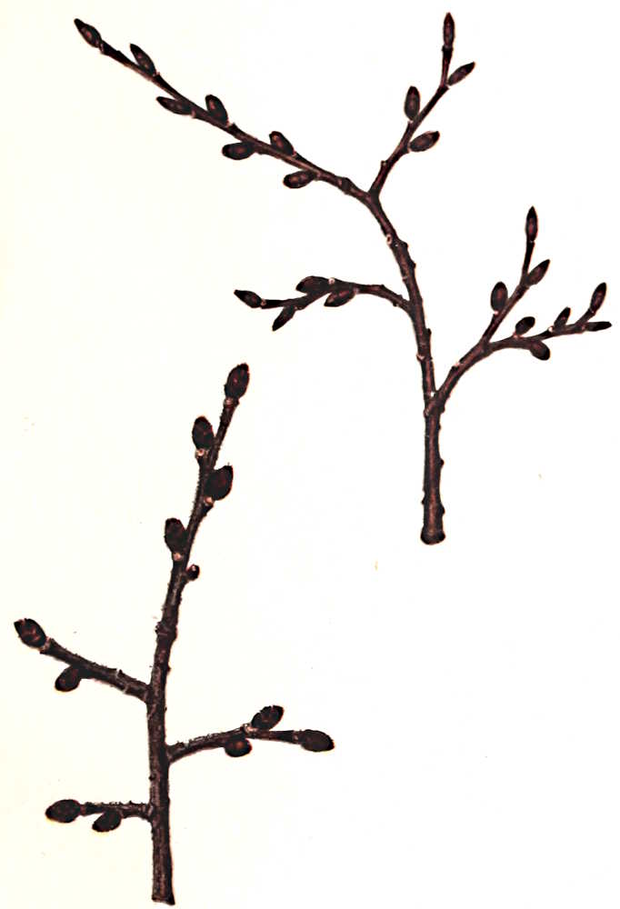 The white willow is really a native of Europe, but for generations in New England it has[Pg 178] associated itself with country landscapes, and there is scarcely a marshy meadow or a stream through a pasture with a water course unmarked by a row of these trees. It seems wonderful that the buds of willows should survive our cold Northern winters as they do, for they are covered with a single scale of delicate texture, and the little undeveloped leaves seem perilously near the cold. The soft woolly catkins of some species,—“the pussy willows,”—which come before the leaves, carry their own protection from cold weather, and even in January, when a few warm days bring them out prematurely, they look comfortable; but the little leaves with their single coverings never come out before the right time, and they never appear to have suffered.